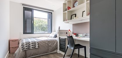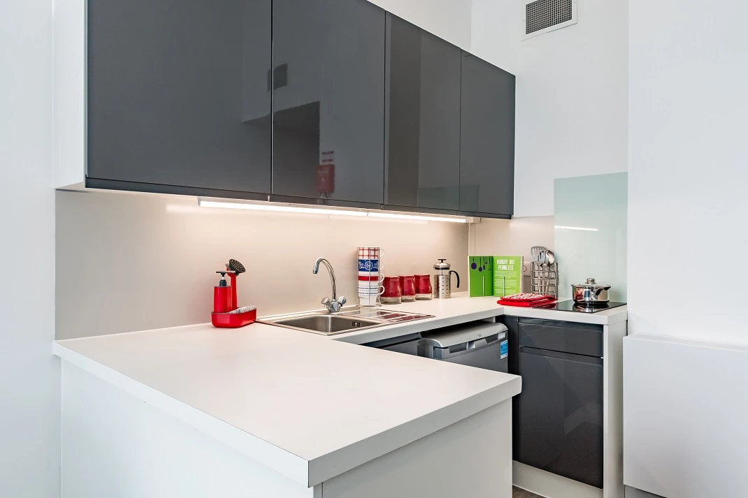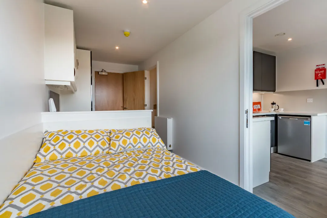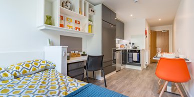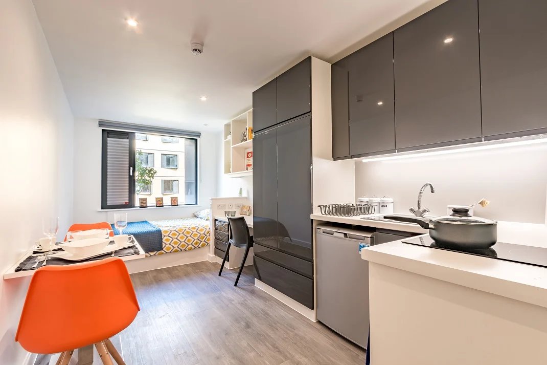 Studio Size: 23.5sqm, A larger student studio with premium features of a double bed, and more floor space. Our elite studio is fitted with all our standard features plus a private well-equipped kitchen, dining table and en-suite.