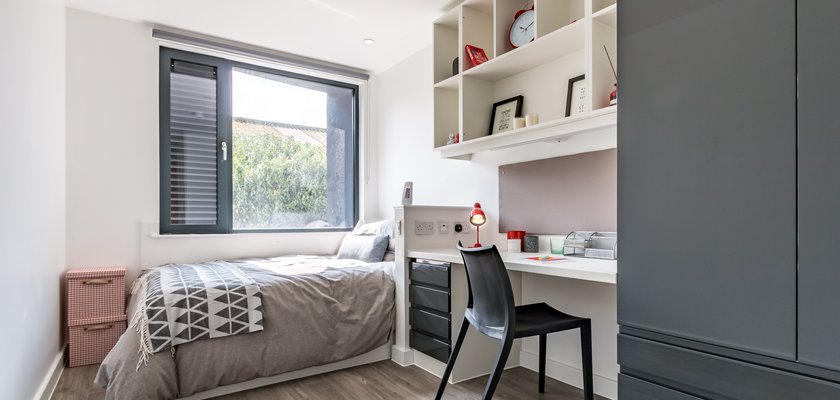 Studio Size: 23.5sqm, The studios with the best views in the building, with floor-to-ceiling windows overlooking the iconic Canterbury Cathedral. Enjoy a spacious, bright, and airy student studio. Our cathedral view studio is fitted with all our standard & premium features plus a private well-equipped kitchen, dining table and en-suite.
