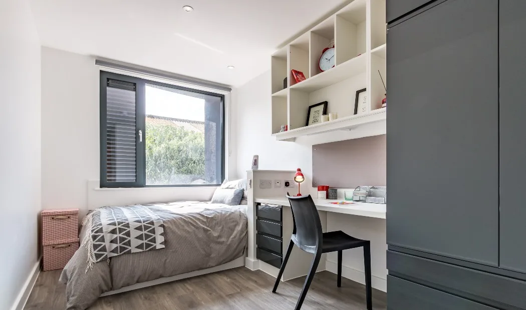 Room Size: 11.7 – 14.7sqm, Our most affordable en-suite student room, fitted with all of our useful standard features plus a shared social space and kitchen to share with your flatmates.