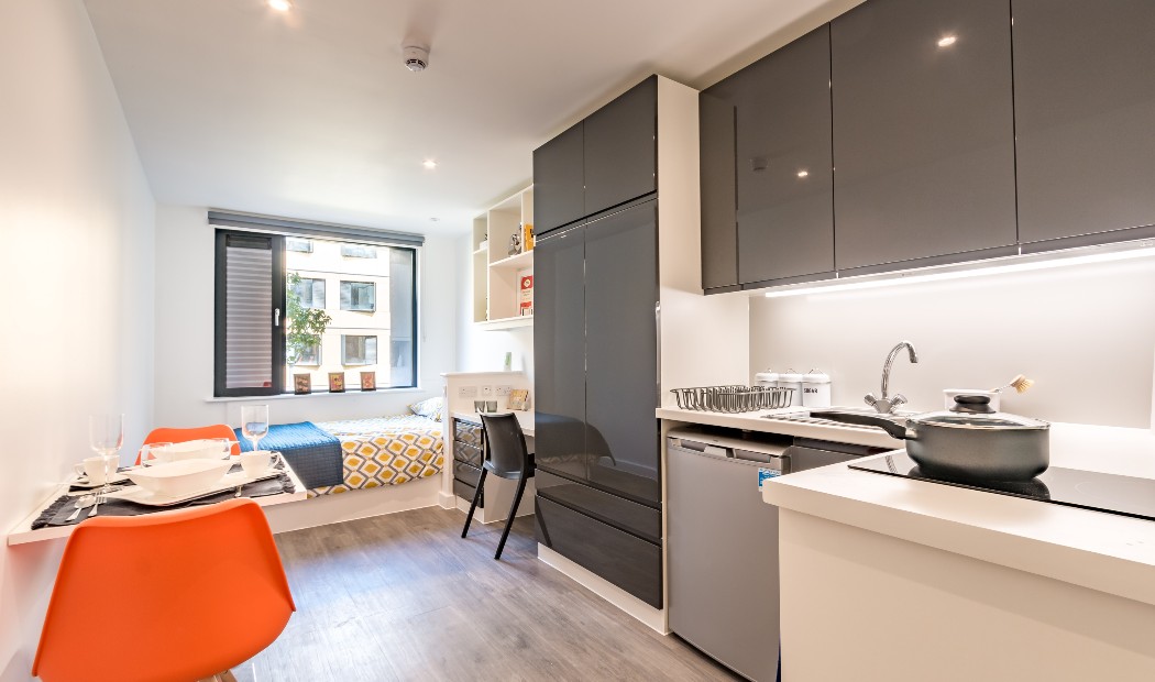 Studio Size: 22.6sqm – 27.8sqm, A spacious student studio with premium features of a double bed, and more floor space. Rhodaus Court’s elite studio is fitted with all our standard features plus a private, well-equipped kitchen, dining table, and en-suite.
