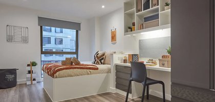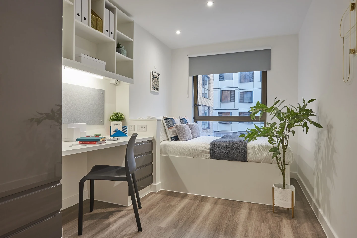 Room Size: 15.2 – 19.8sqm, Our luxe en-suite student room has all of our standard features, plus extra floor space to enjoy. You’ll also get a shared social space and kitchen to hang out with your flatmates.