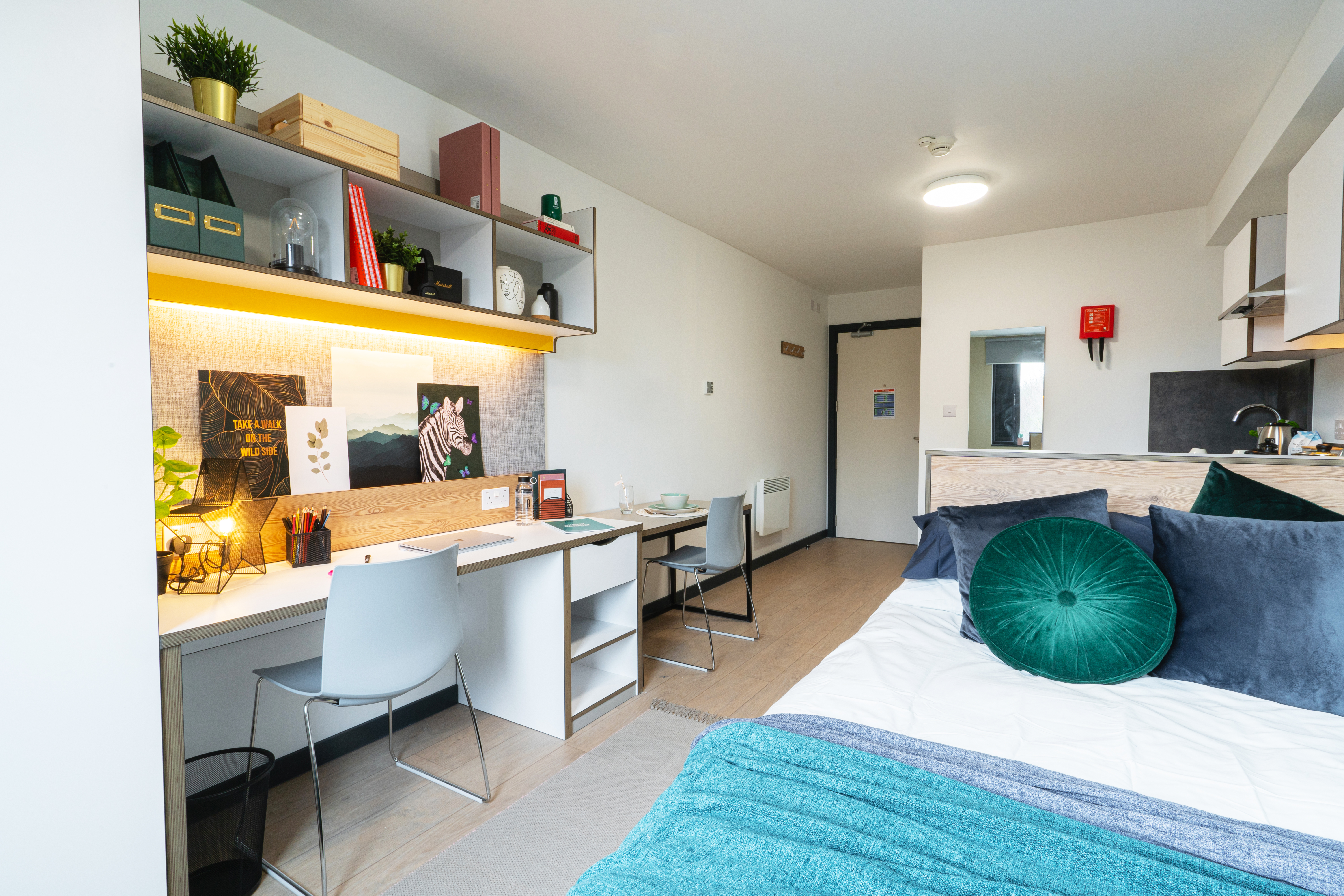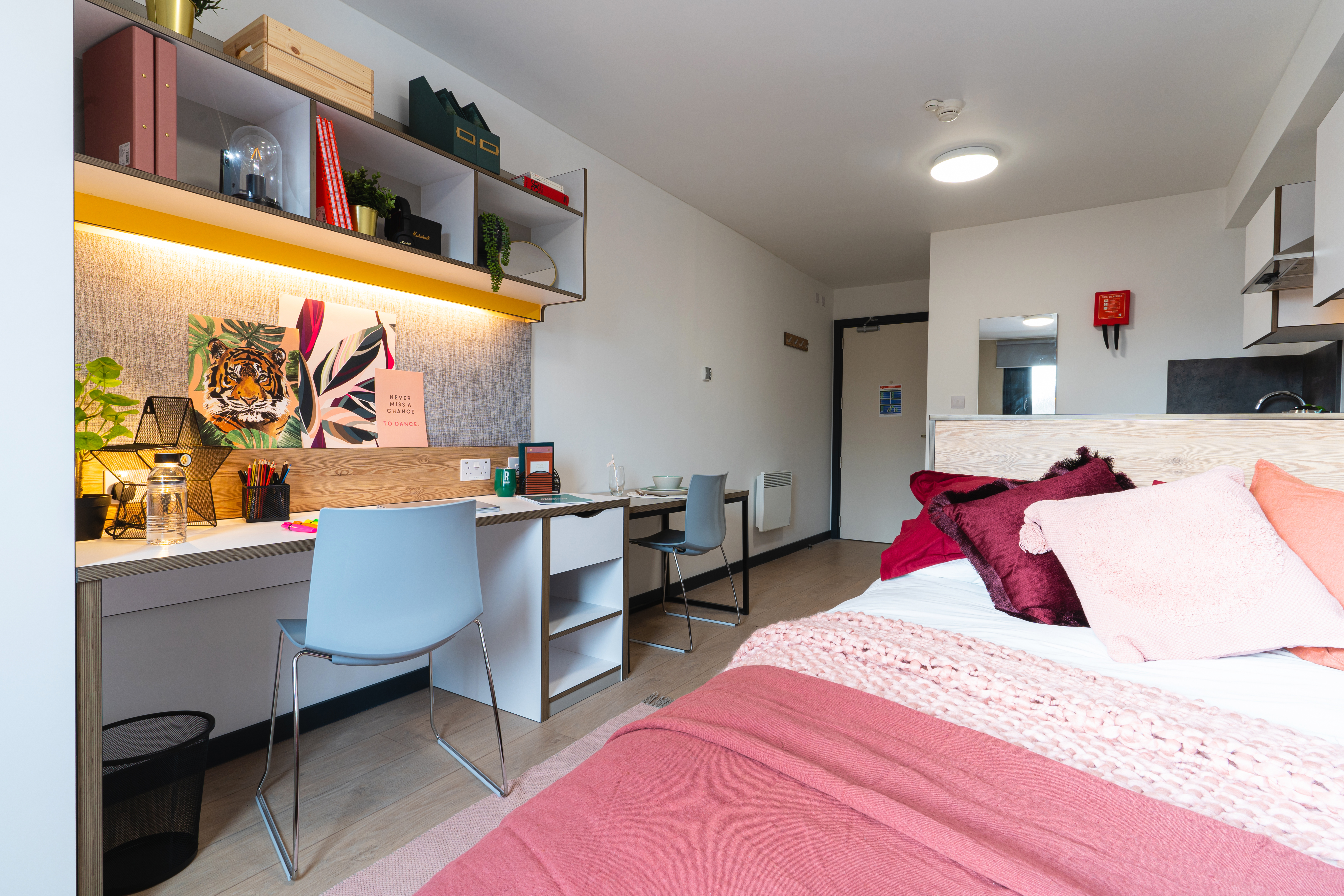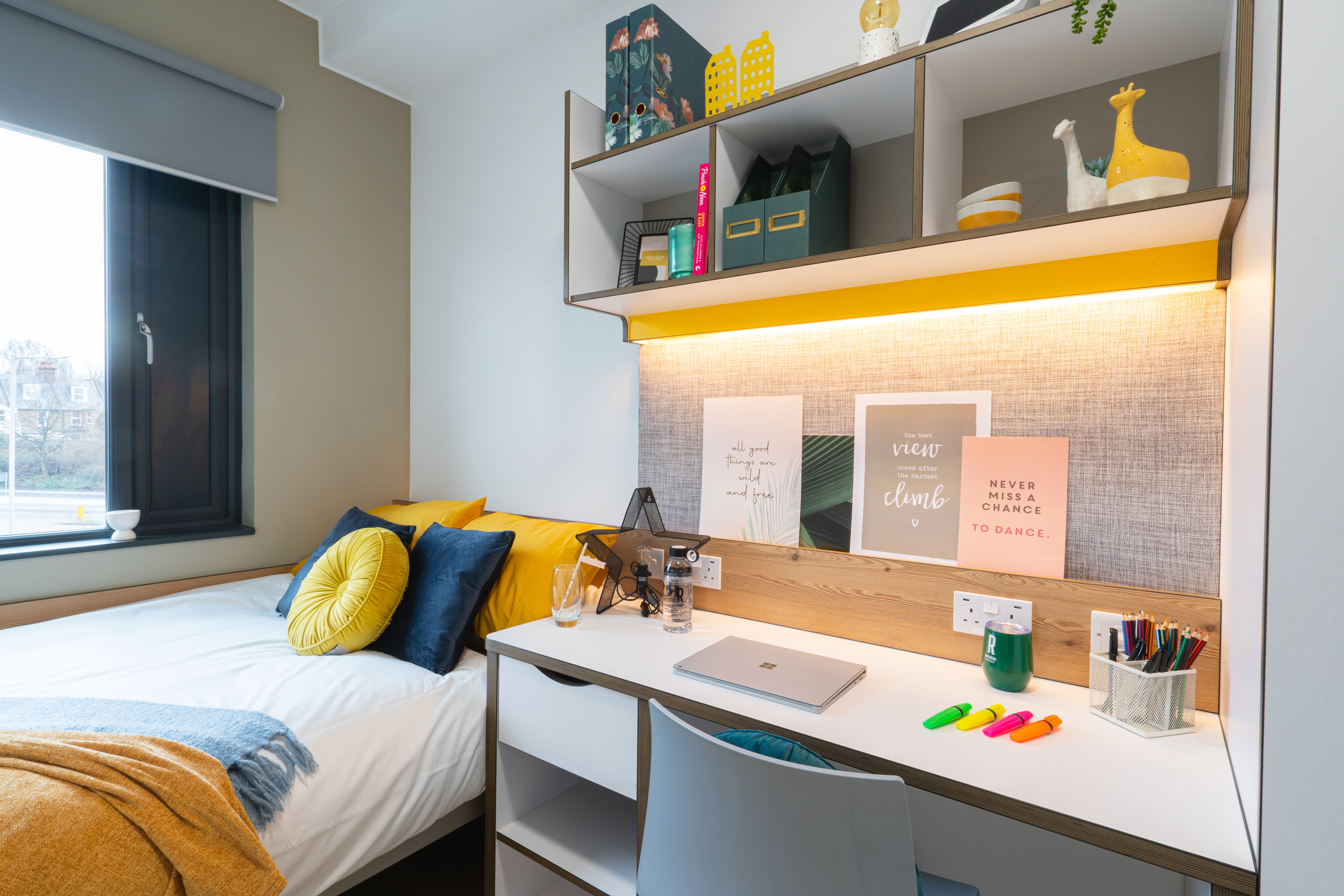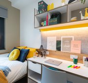 This modern en suite room measures from 12.3m2 with a small double bed, double wardrobe, desk and stylish en-suite bathroom.