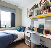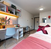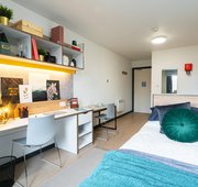 This modern en suite room measures around 12.3m2 with a small double bed, double wardrobe, desk and stylish en suite bathroom and shares a kitchen with one other person. Adjoining private kitchen, including microwave oven and fridge.