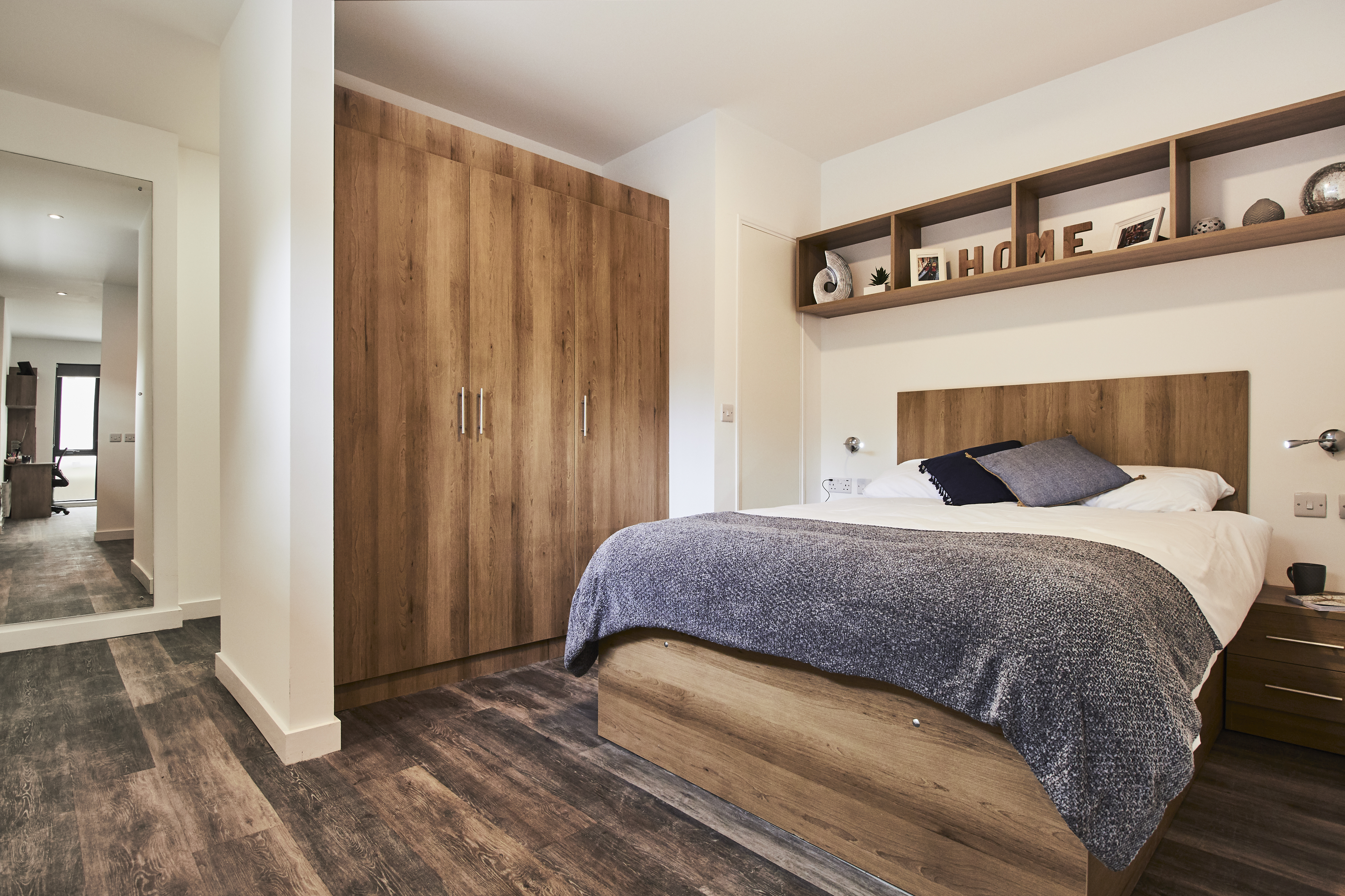 Room sizes can vary from 37m2 to 38m2. Dual occupancy available. Double bed 2 bed side cabinets and shelving Large 3 door fitted wardrobe Private en-suite shower room, large cubicle with power shower, 2 storage cabinets Private kitchen with full size oven, separate microwave, 4 ring hob and fridge freezer Dining table with 2 dining chairs 2 seater sofa Desk Study chair Plenty of storage