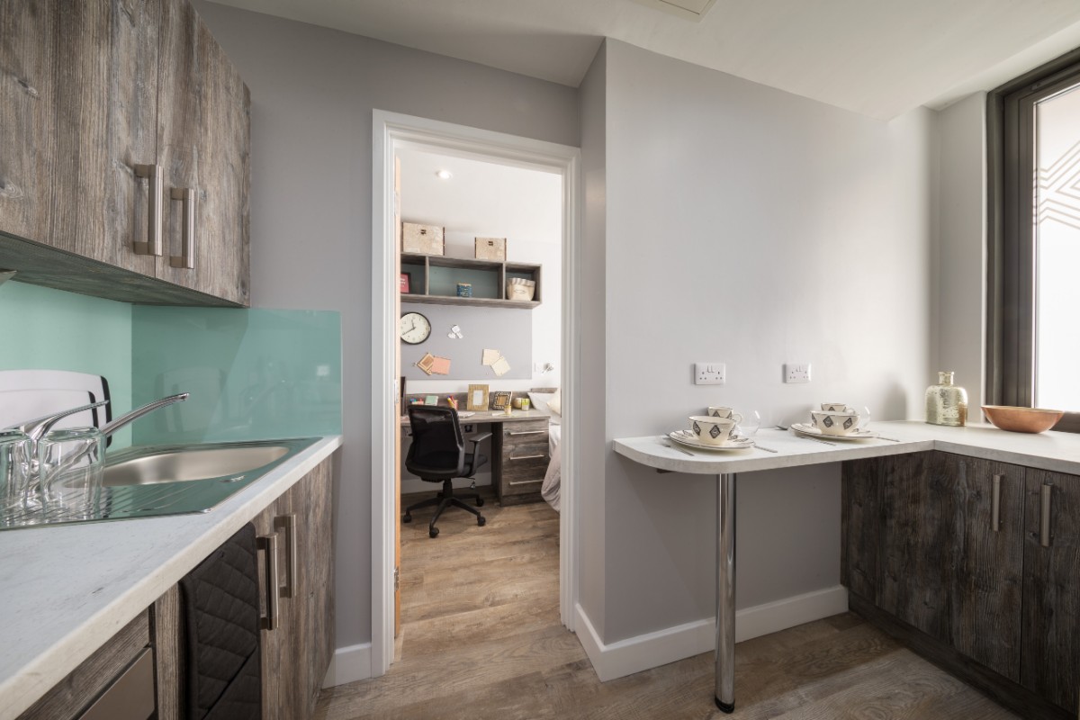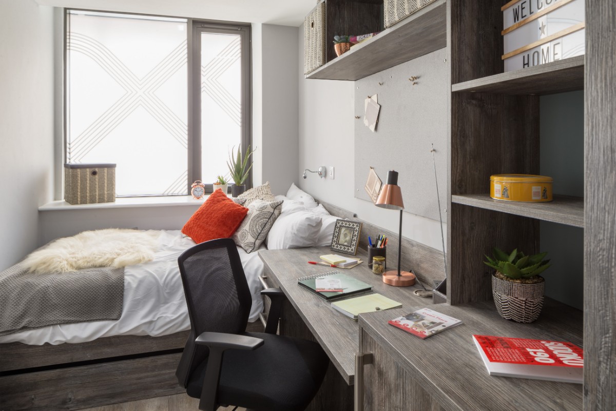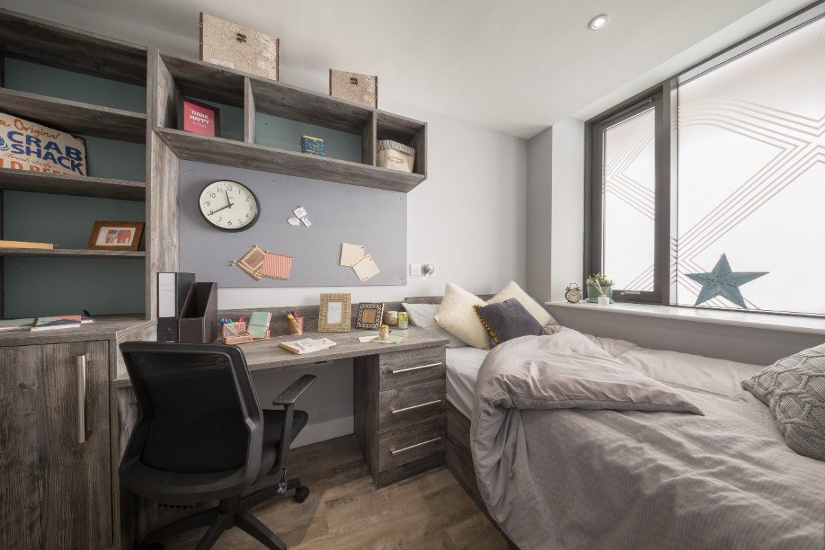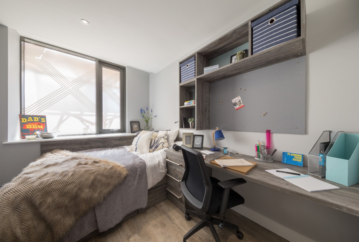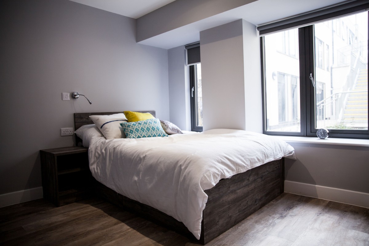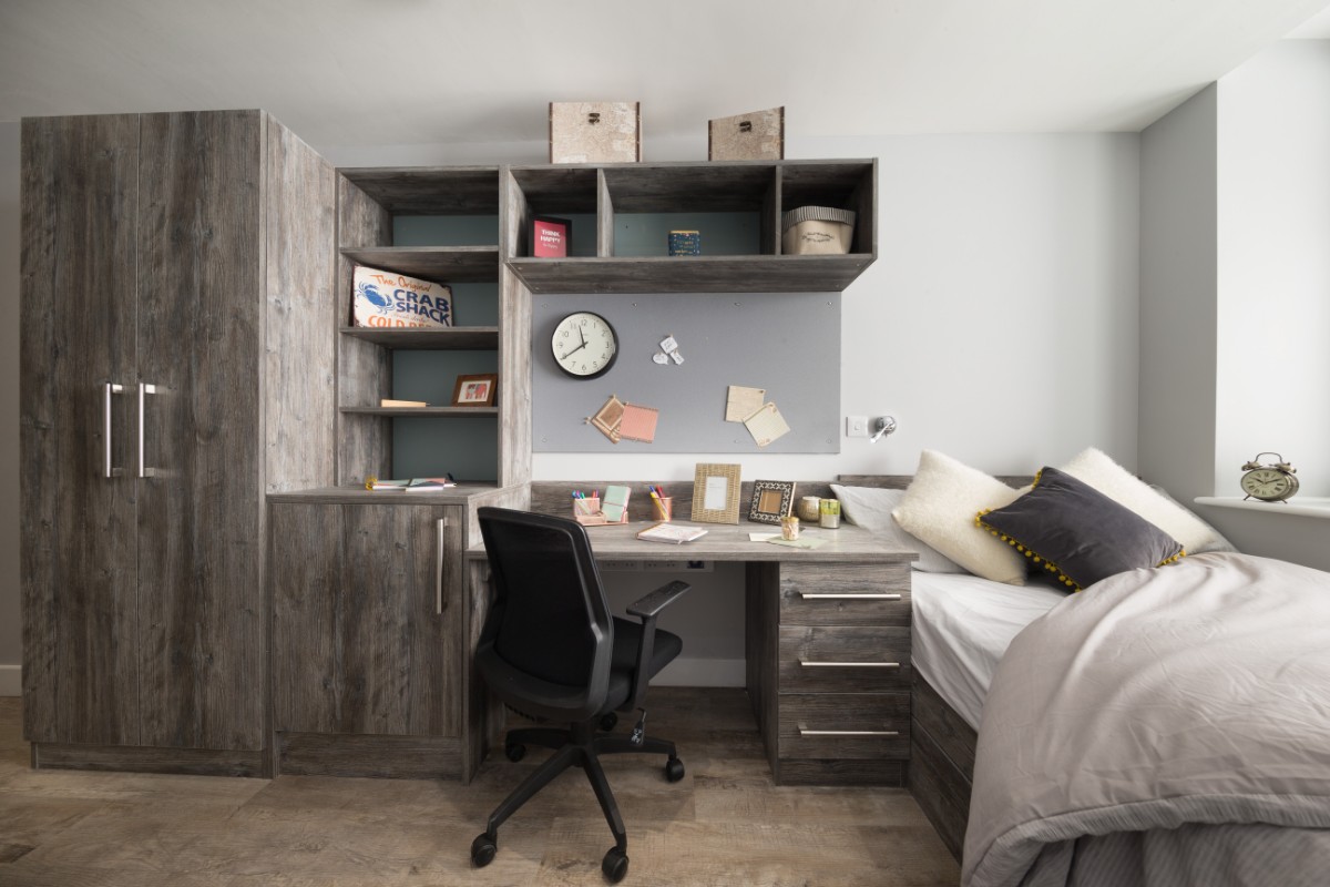26m2 to 36m2 Situated on 2nd and 3rd floors 3/4 size double bed with underbed storage Private en-suite shower room Shared kitchen with 2 ring hob and combi microwave oven and breakfast bar Personal fridge freezer in each room Built-in desks and underdesk power points Private room access each