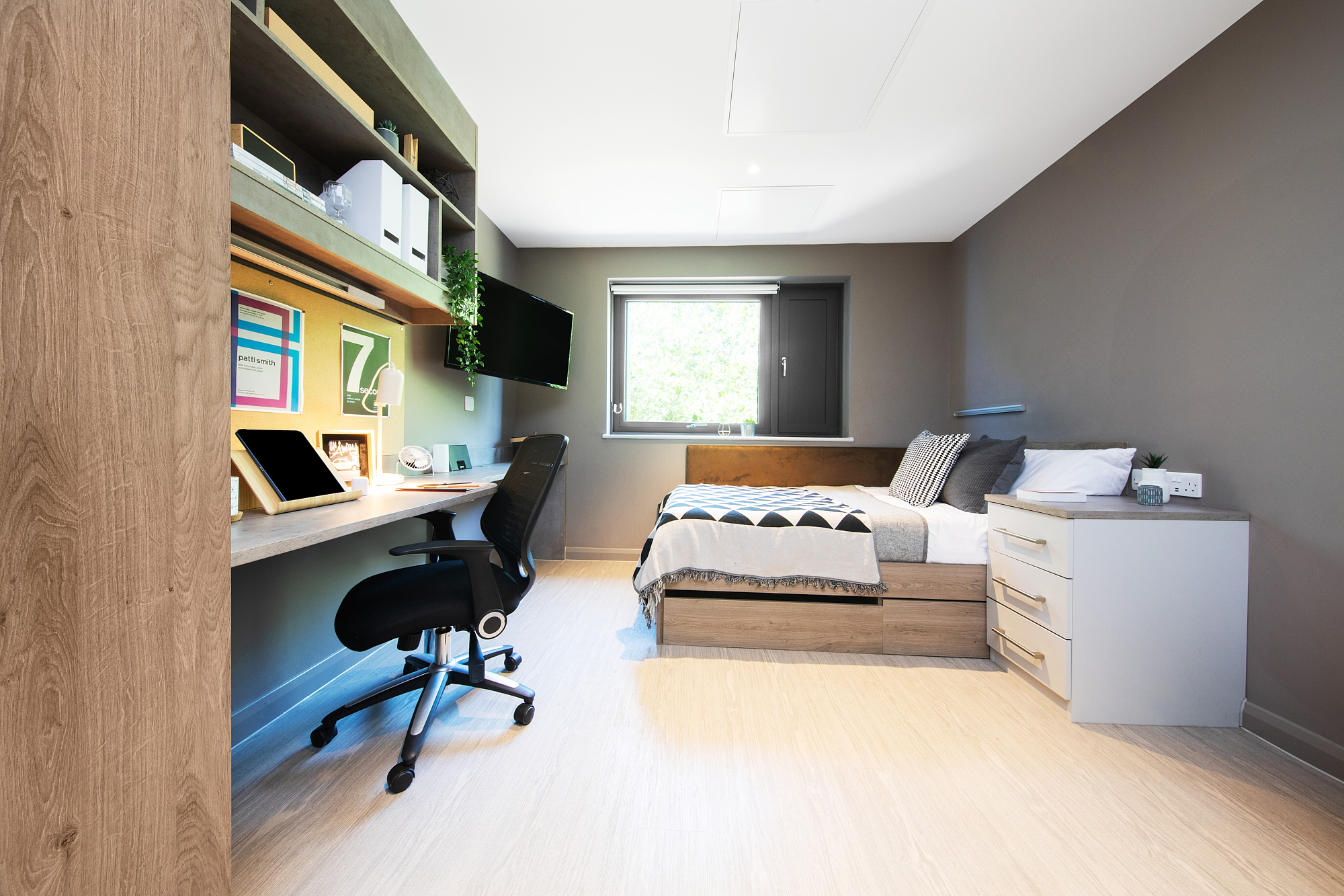 Ensuite bedroom (9.7-10.7m2) in a shared 2Bed flat. A 9.7-10.7m2 bedroom and your own private bathroom in a shared apartment with 2 bedrooms, High specification design, 40-inch television in each bedroom (licence not included), 3/4 bed with under-bed storage, Double, USB chargers, Large desk space, Luxury mesh-backed adjustable study chair, Double wardrobe with shelves and full-length mirror, Private en-suite bathroom with shower