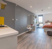 Room size: 18-19m2 3/4 size double bed with underbed storage Large desk with notice board Plenty of storage and shelving Private ensuite shower room Private kitchen with 2 ring hob, combi microwave oven and fridge/freezer Dining table and chair Lounge chair Dual occupancies available!