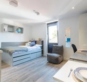 Room size: 25m2 3/4 size double bed with underbed storage Private ensuite shower room Private kitchen with 2 ring hob, combi microwave oven and fridge/freezer Large desk with notice board Plenty of storage and shelving Dining table and chair Lounge chair Dual occupancies available!