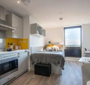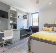 Price shown is price per person Room size: 30m2 3/4 size double bed with underbed storage Large desk with notice board Plenty of storage and shelving Shared bathroom between two Shared kitchen between two with 2 ring hob, combi microwave oven and fridge/freezer Dining table and chairs Lounge chairs Accessible/DDA rooms also available