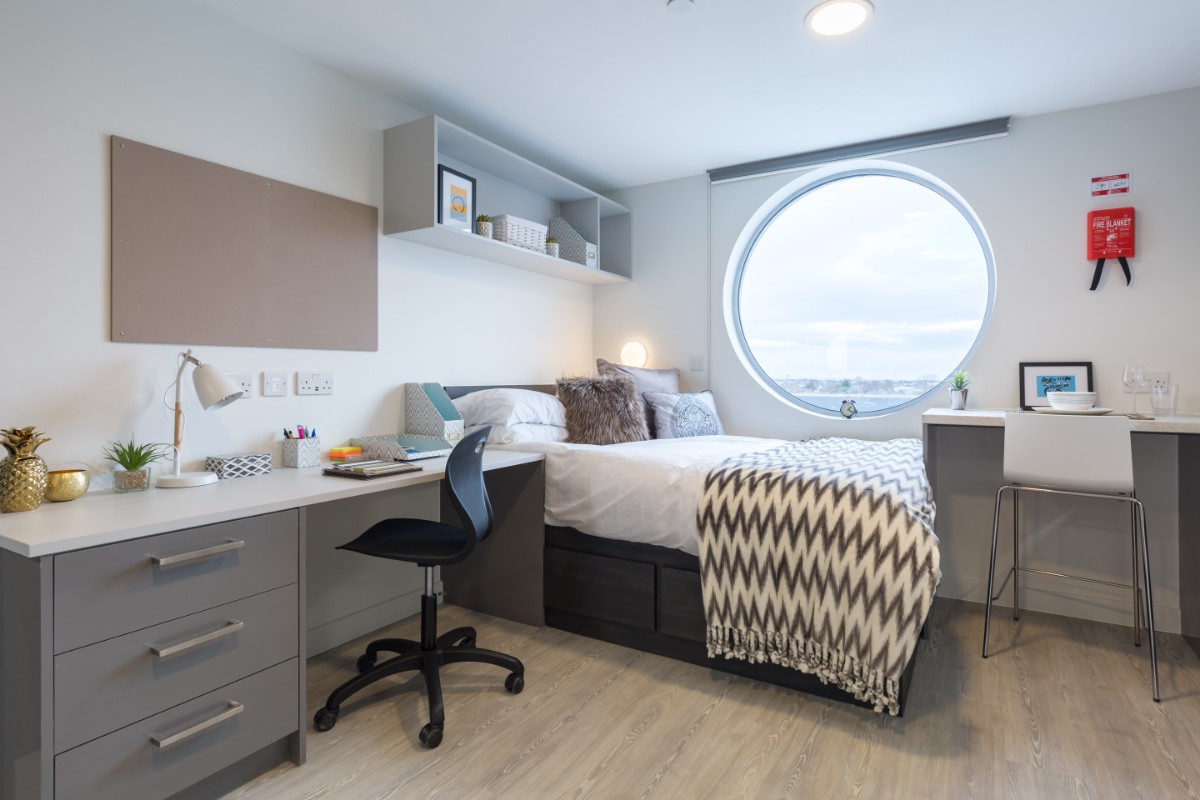 Floor: 4th, Classification: Premium, Includes: Fully-furnished studio room with a 3/4 double bed, private bathroom and Private open plan kitchen. There's plenty of storage space including bedside table, wardrobe and underbed storage, plus a desk and chair for studying. Your open plan kitchen comes complete with oven, induction hob and under counter fridge. Free Wi-Fi & wired internet (100Mb) plus contents insurance and all your bills included as standard. Extra features: Room size from 19m², 3/4 double bed, en-suite shower room, private open-plan kitchen, electric heater, underbed storage, bedside table and wardrobe, desk & chair, all bills included, free Wi-Fi & internet, and free contents insurance.