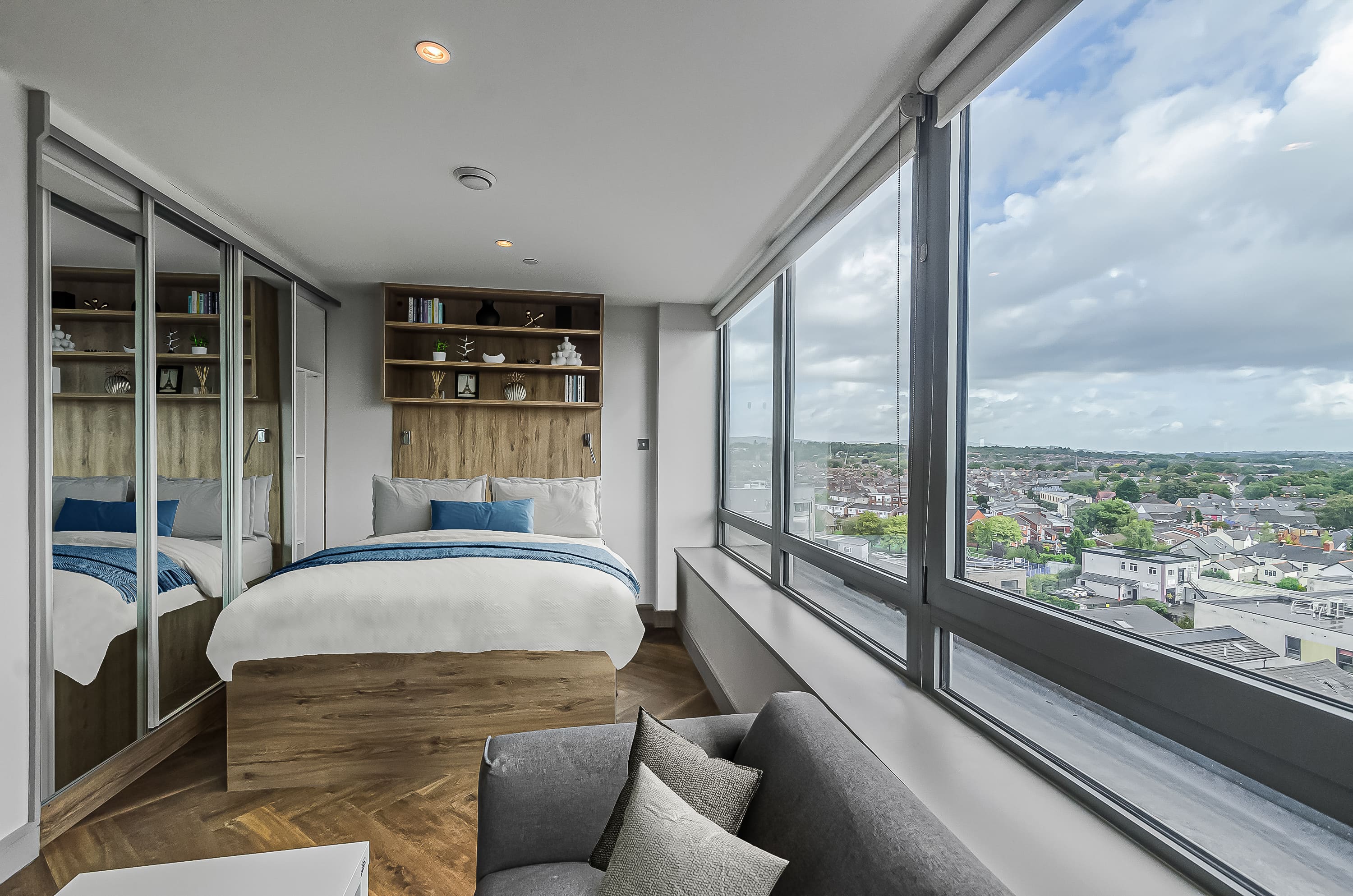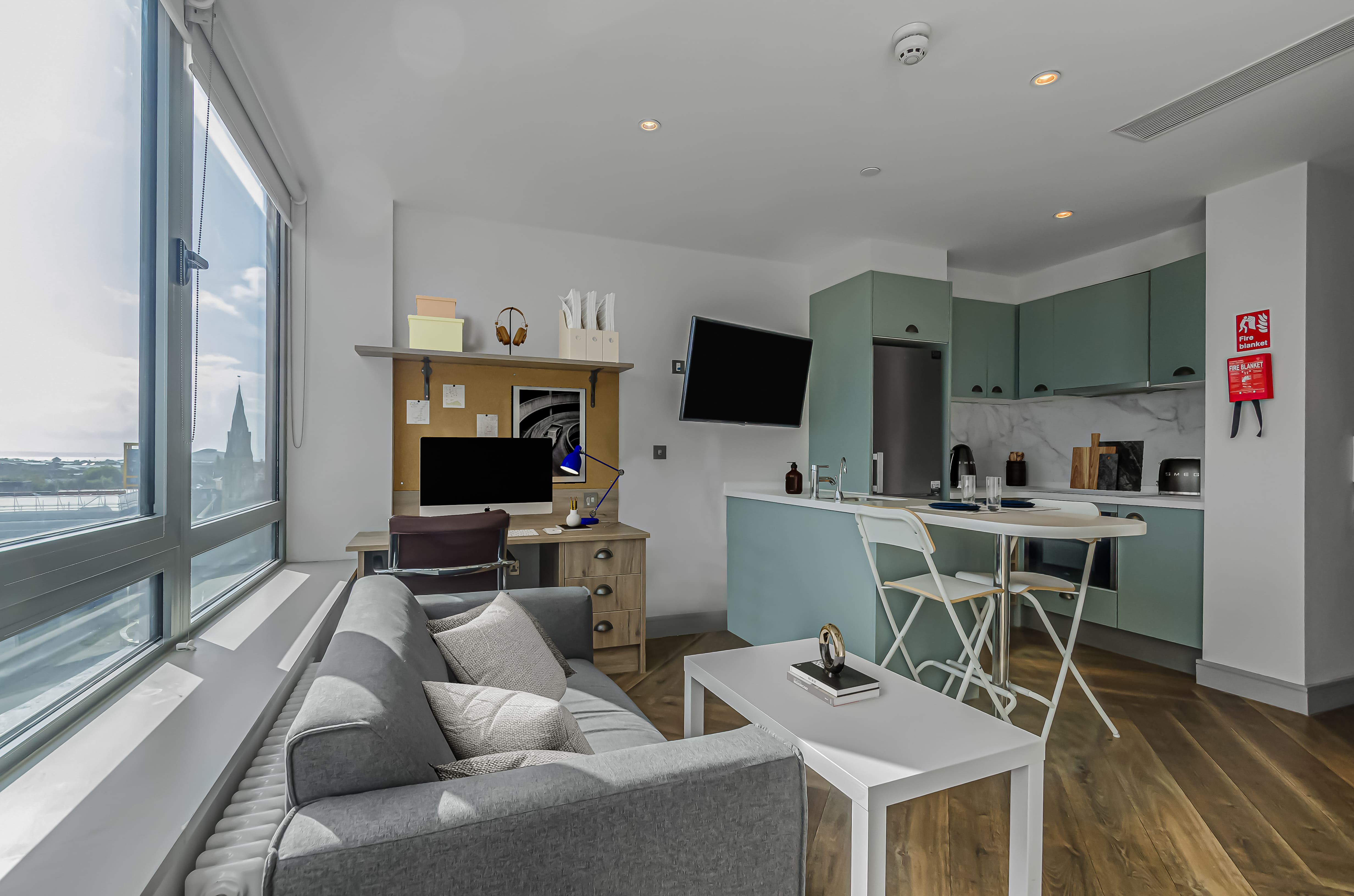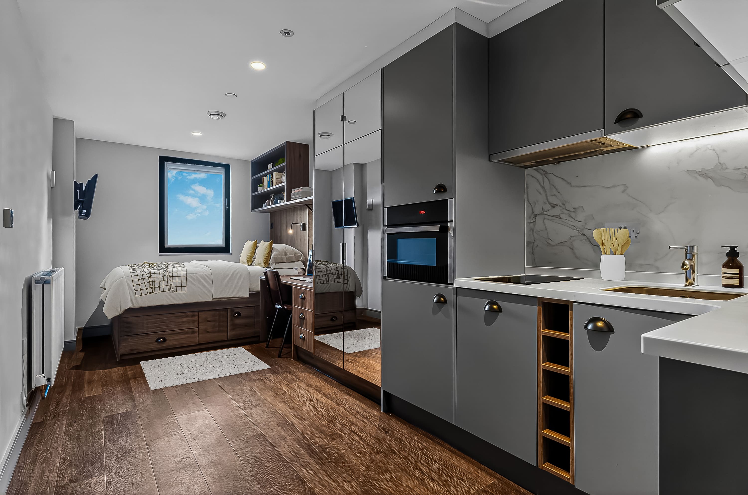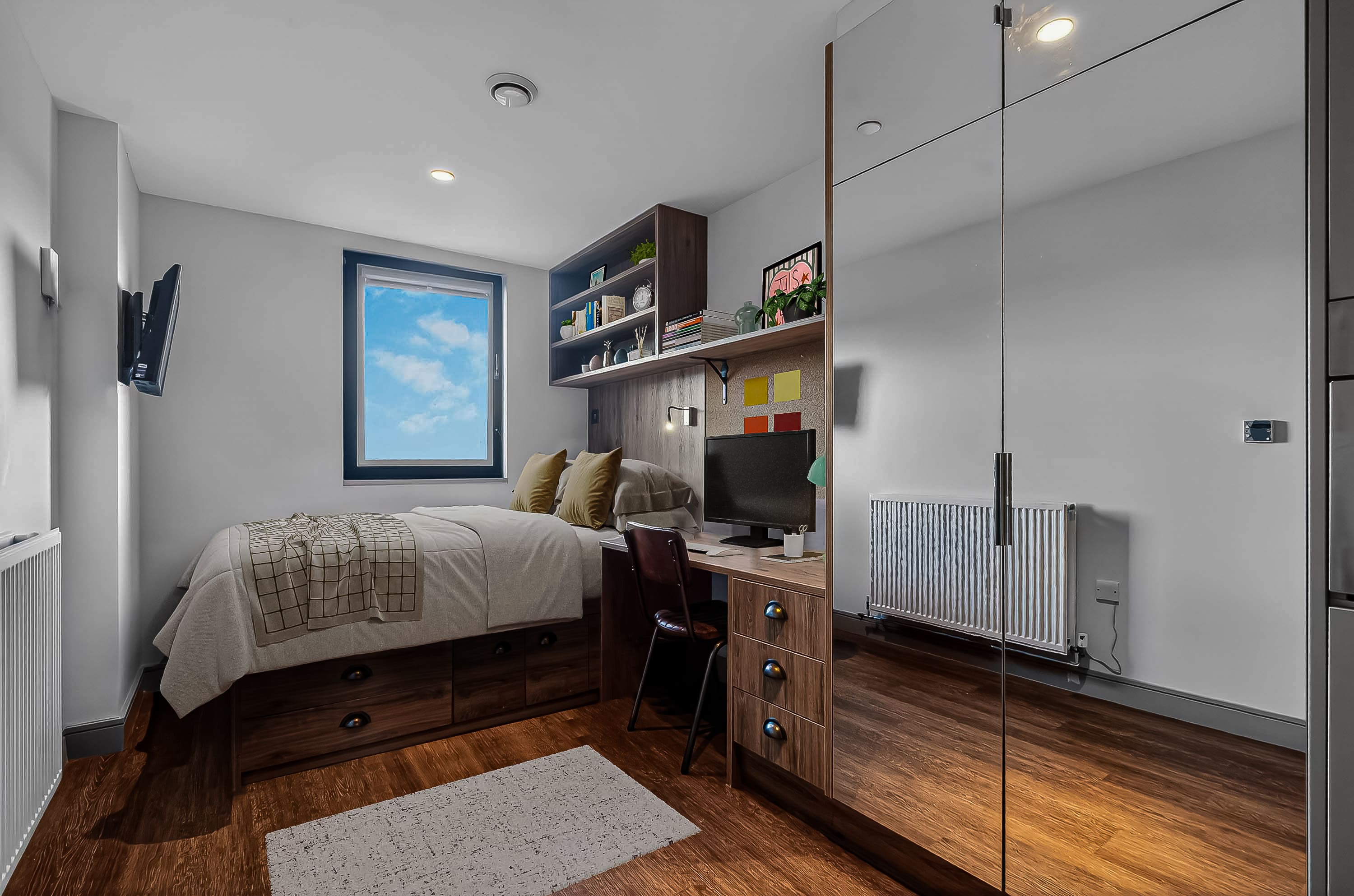 The rooms are wonderful too, modern design and just perfect for classy student living. I stayed in a bronze studio all 3 years, and that size was perfect with so much storage too! A smart TV, a BIG showerhead, full length mirrors, double bed, dishwasher - what more could you ask for!