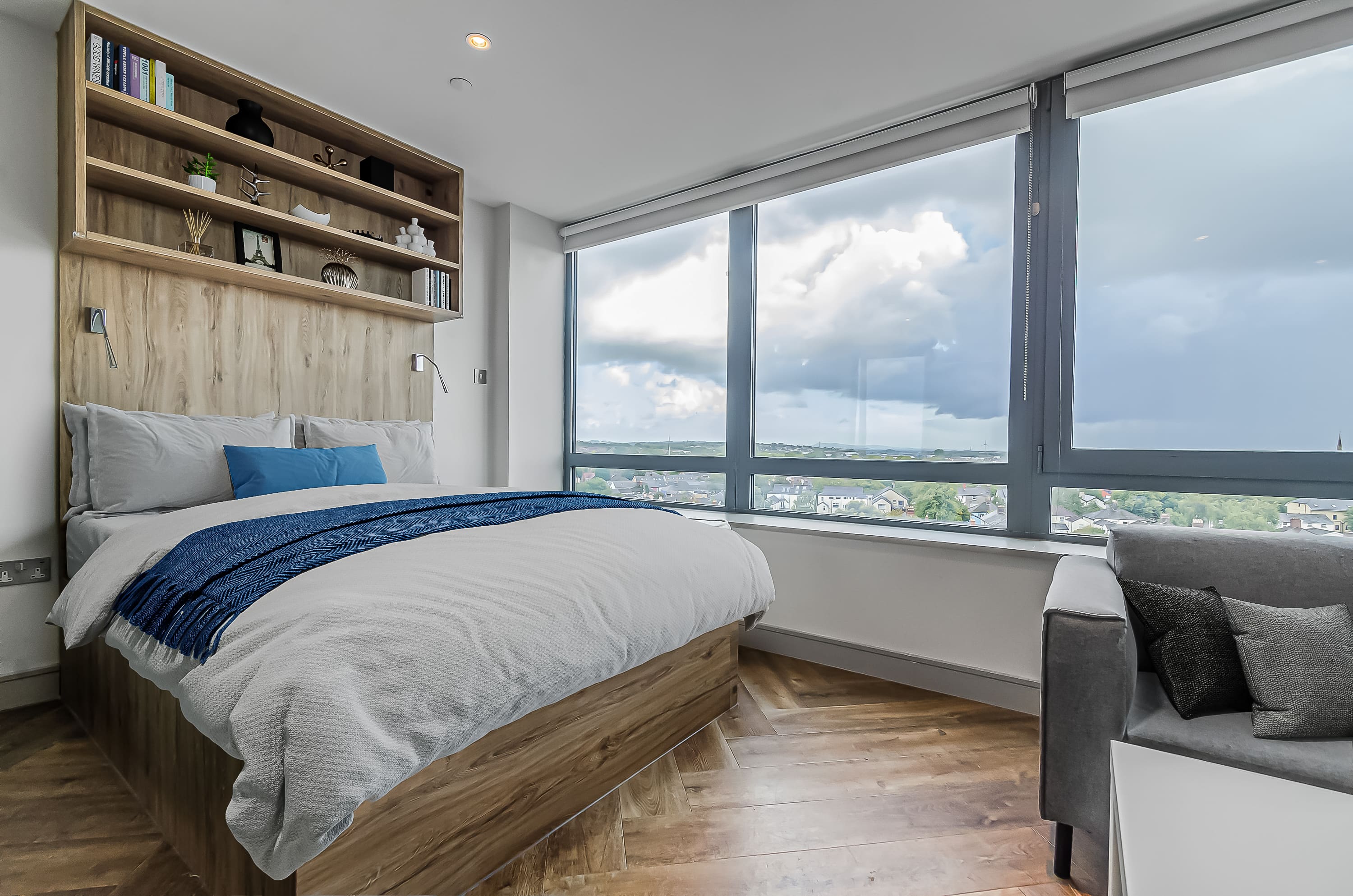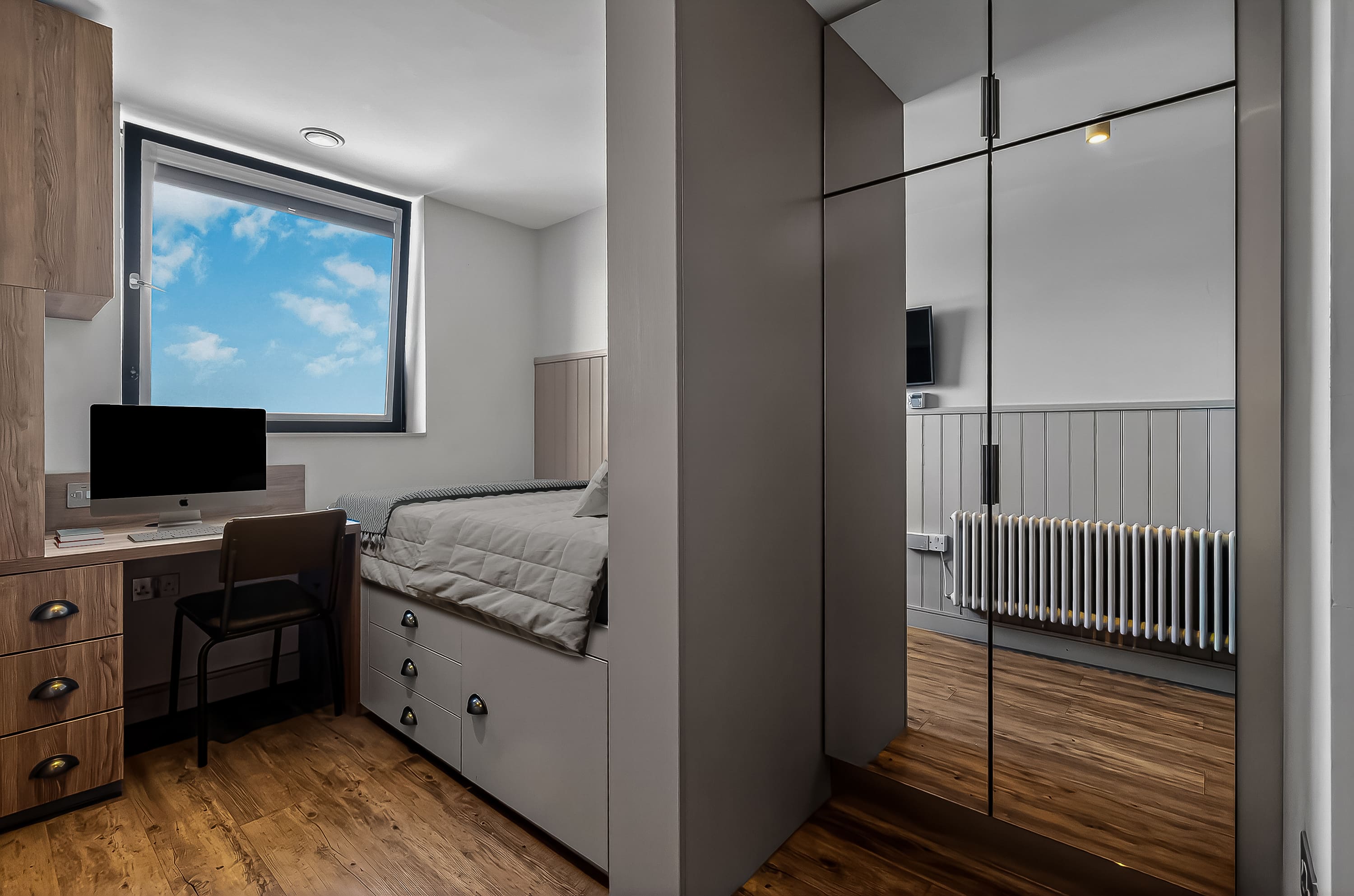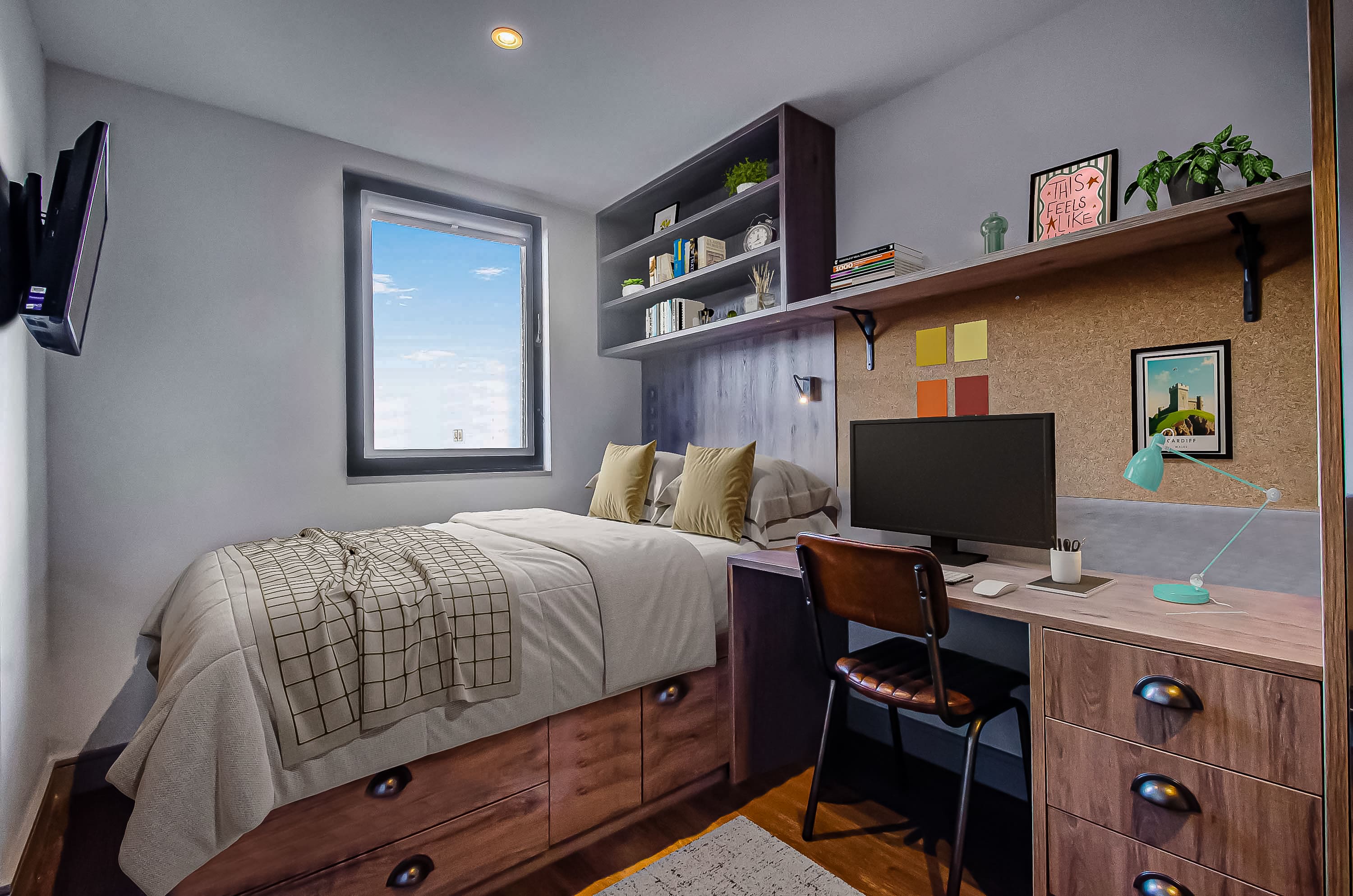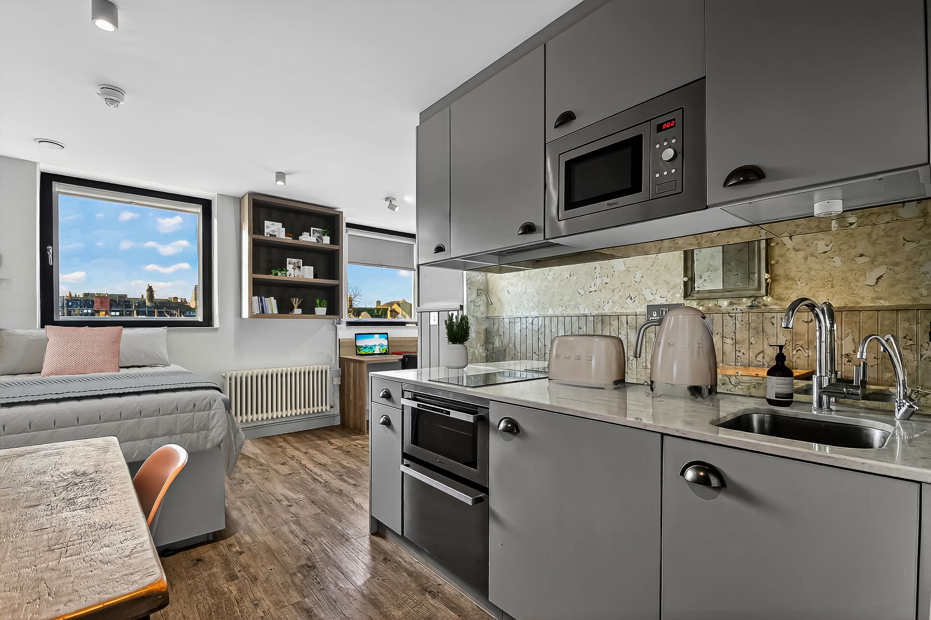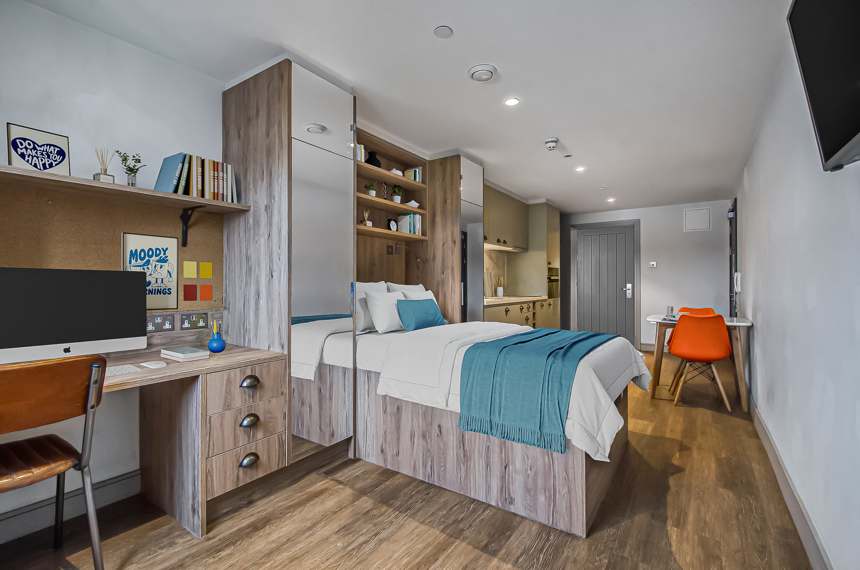 The rooms are wonderful too, modern design and just perfect for classy student living. I stayed in a bronze studio all 3 years, and that size was perfect with so much storage too! A smart TV, a BIG showerhead, full length mirrors, double bed, dishwasher - what more could you ask for!