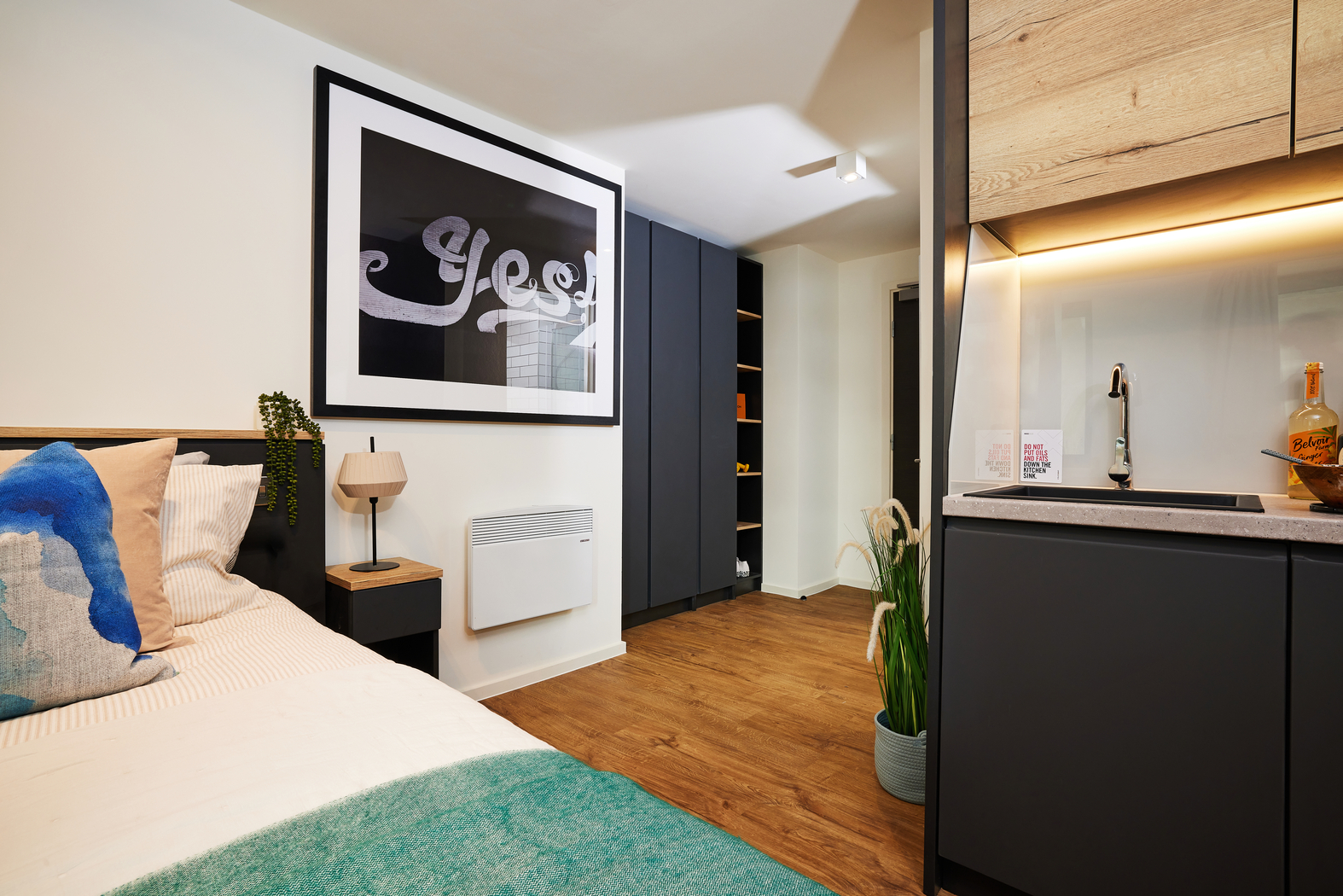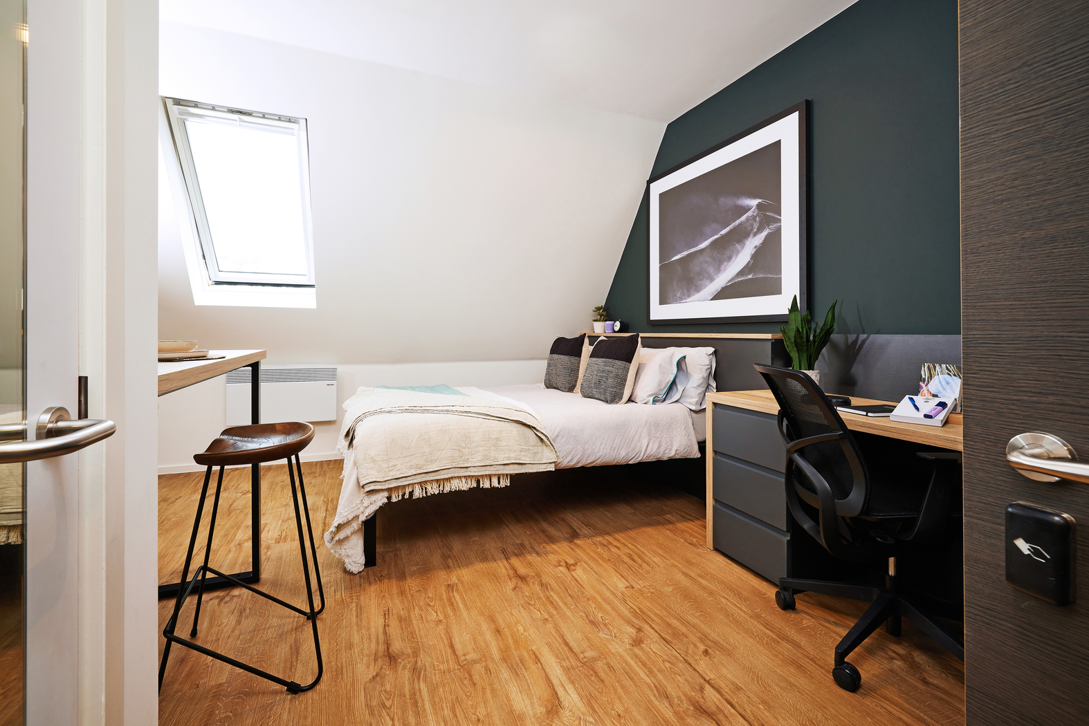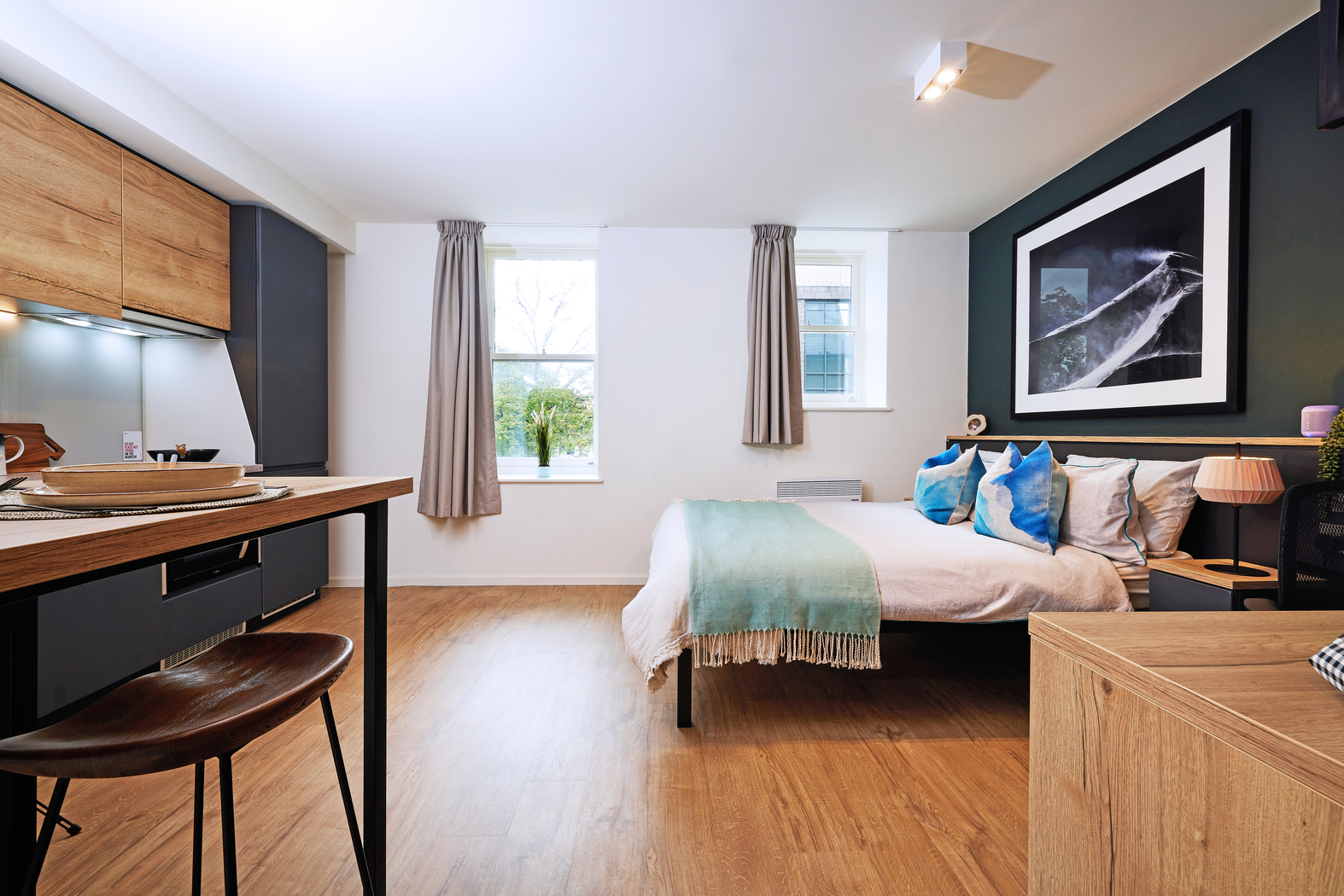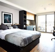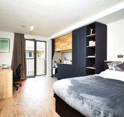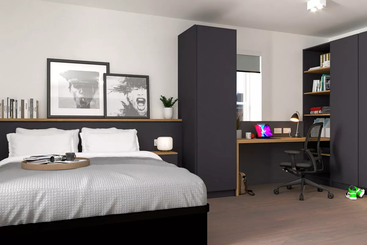 The classic Vita Student studio with double bed, ensuite bathroom, desk area, and kitchen. Prices may vary as per the floor level.