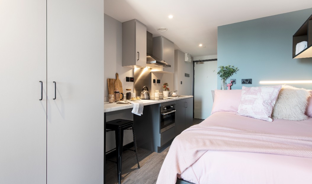 Your own private Studio Apartment High specification design 40” Smart Televisions (license not included) Double Beds with Under-bed storage Double USB Chargers Large desk space Double wardrobe with shelves and full-length mirror Private en-suite bathroom with shower Pin-board Ample shelving space Luxury adjustable Study Chair Coat hooks Electronic Room Key Radiator What’s in the kitchen? Combination Microwave / Oven / Grill Breakfast bar and stools Storage space Under counter Fridge / Freezer Recycling Bins 4 ring induction hob Cooking Extractor Hood Safety Cut out Cooking System