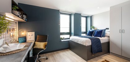 What's in the room? - Room sizes may vary - Your own private Studio Apartment - High specification design - 40 Smart Televisions (license not included) - Double Beds with Under-bed storage - Double USB Chargers - Large desk space - Double wardrobe with shelves and full-length mirror - Private en-suite bathroom with shower - Pin-board - Ample shelving space - Luxury adjustable Study Chair - Coat hooks - Electronic Room Key - Radiator - What's in the kitchen? - Combination Microwave / Oven / Grill - Breakfast bar and stools - Storage space - Under counter Fridge / Freezer - Recycling Bins - 4 ring induction hob - Cooking Extractor Hood - Safety Cut out Cooking System