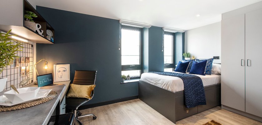 Each room at Zenith accommodation has a private bathroom, a desk, a double bed, and a smart TV, making it the ideal place to study and unwind. Aside from your room, Zenith Cardiff offers a massive variety of amazing on-site amenities for you to use in your free time, including a sports centre with a basketball half-court, a gym, a combat zone, many classroom spaces, a sky bar, a cinema room, an entertainment room, a private dining room, a music area, a wellness room, and study spaces.