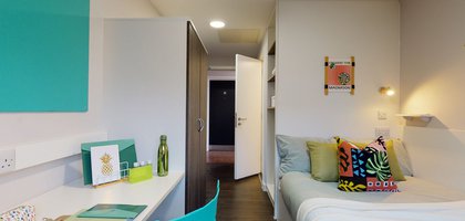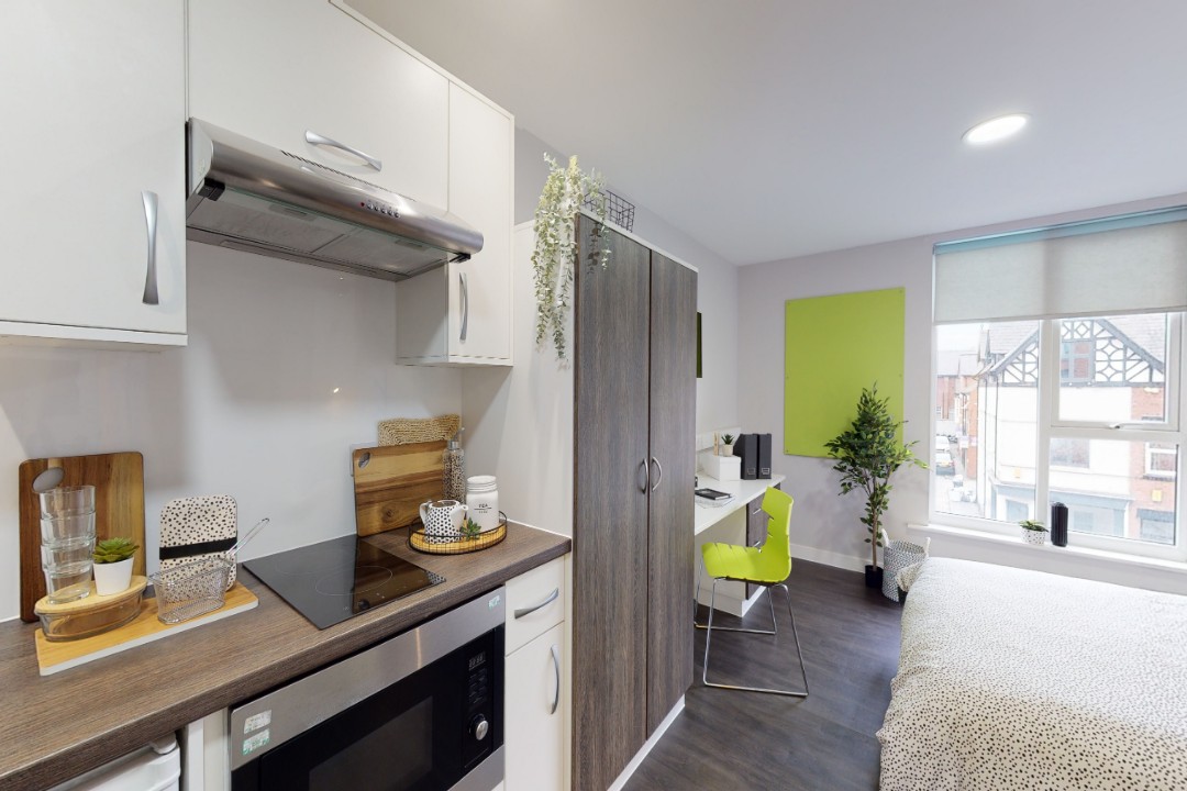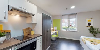 20 sqm Large desk and chair Double bed Open plan kitchen En-suite Free Wi-Fi (up to 100Mb shared) Freeview TV