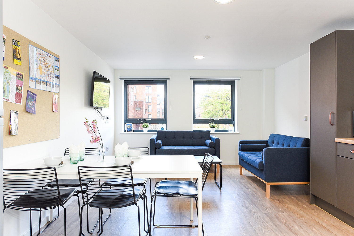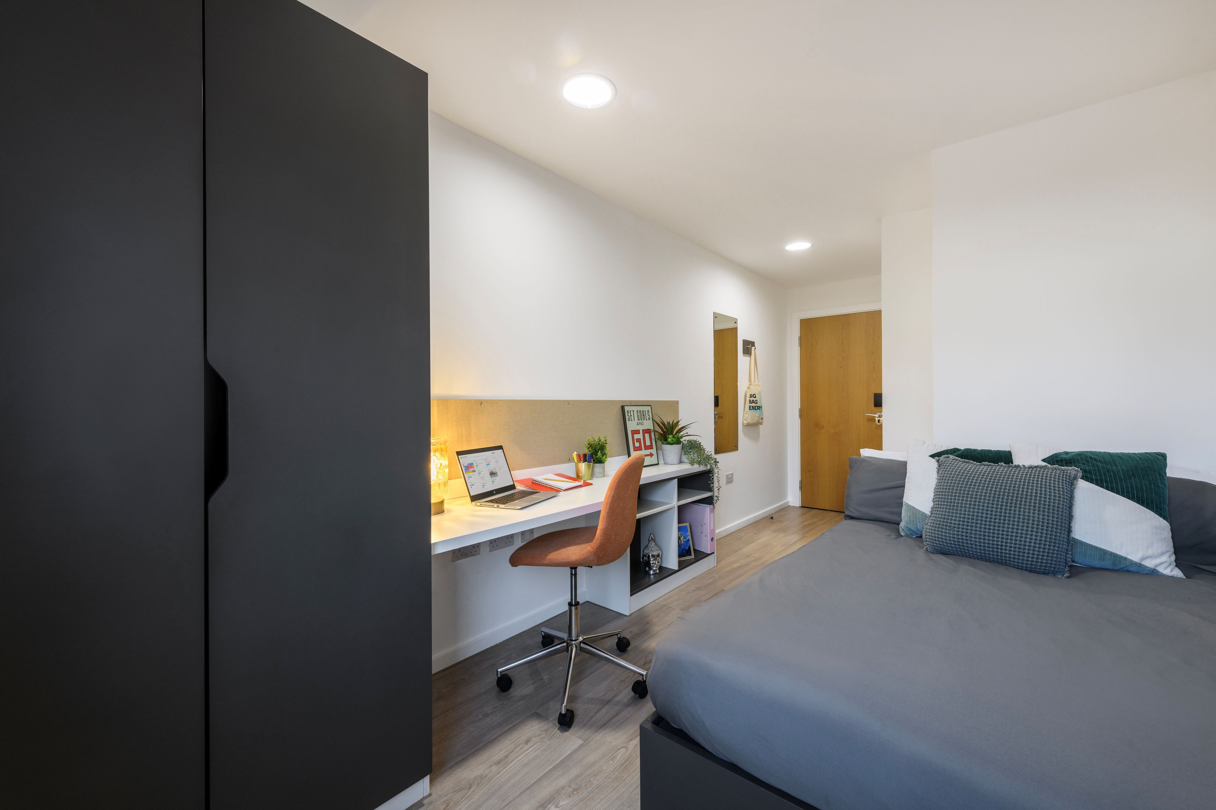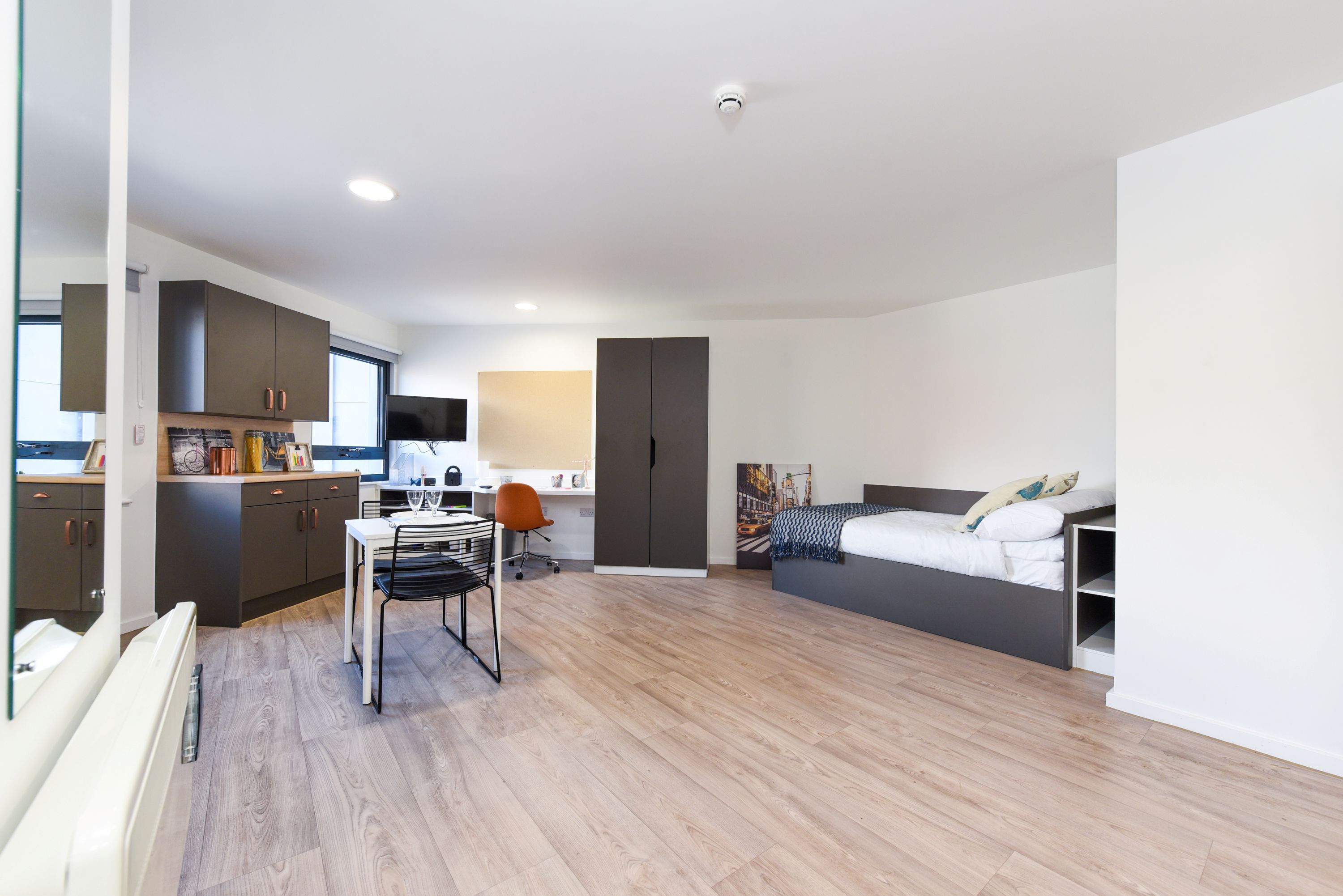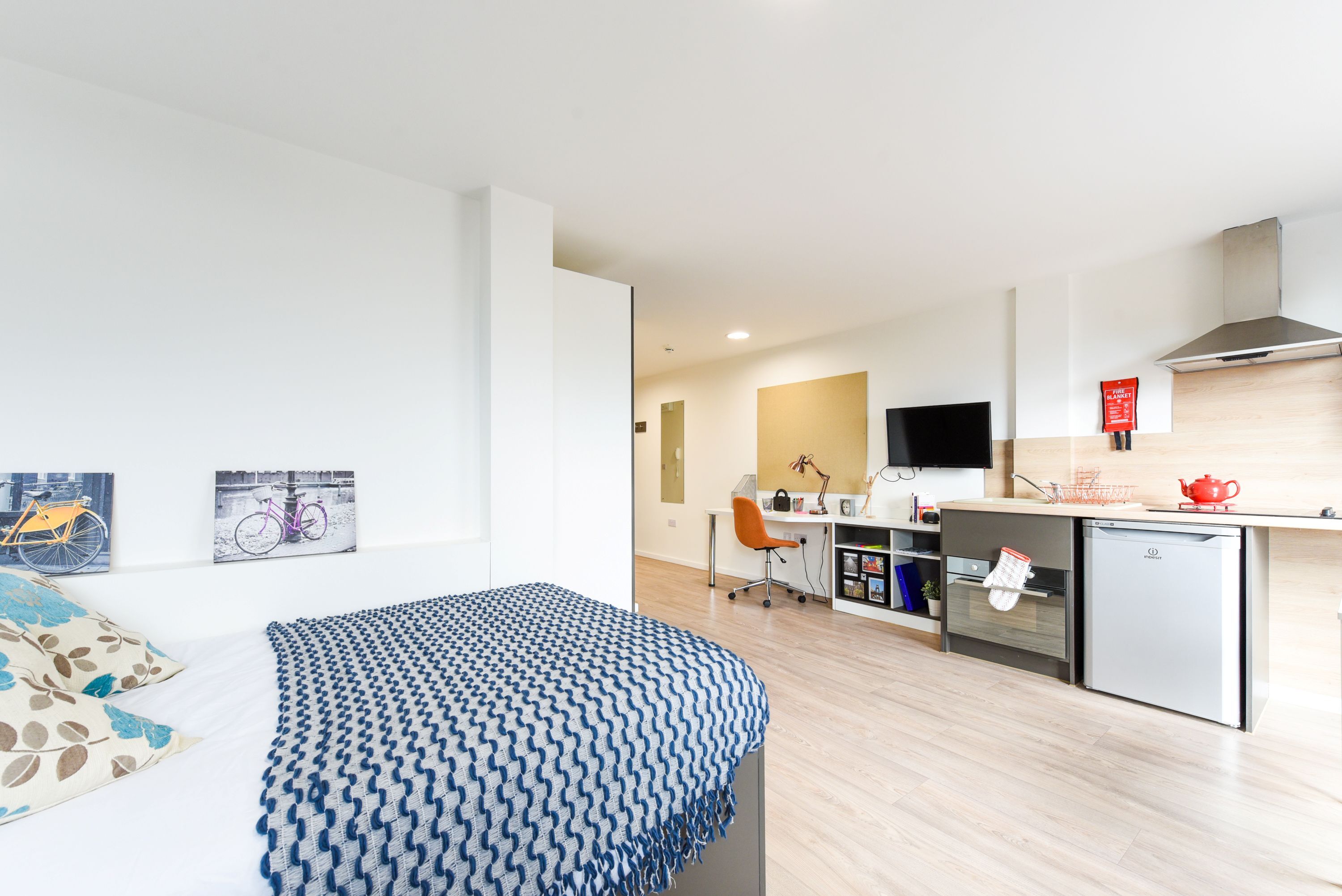 Communal kitchen and living space with TV. Up to 6 en-suite rooms per flat. Canal View Approximately 13.5-14m² Small double bed Underbed storage, desk, chair and wardrobe provided in room
