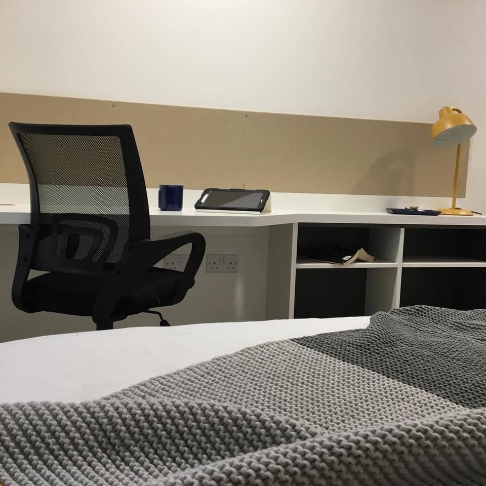 Communal kitchen and living space with TV. Up to 6 en-suite rooms per flat Approximately 15.5 - 20m² Small double bed Underbed storage, desk, chair and wardrobe provided in room Accessible wetroom facilities First floor location and easy access to lifts