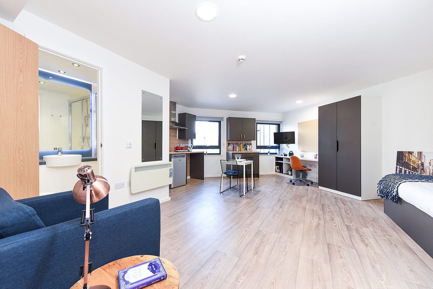 Self-contained kitchen, bathroom and living space Approximately 19.5m² Small double bed Underbed storage, desk, chair, wardrobe and TV provided in room