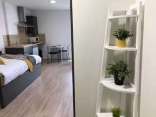 Self-contained kitchen, bathroom and living space Approximately 23 – 27.5m² Small double bed Underbed storage, desk, chair, wardrobe and TV provided in room