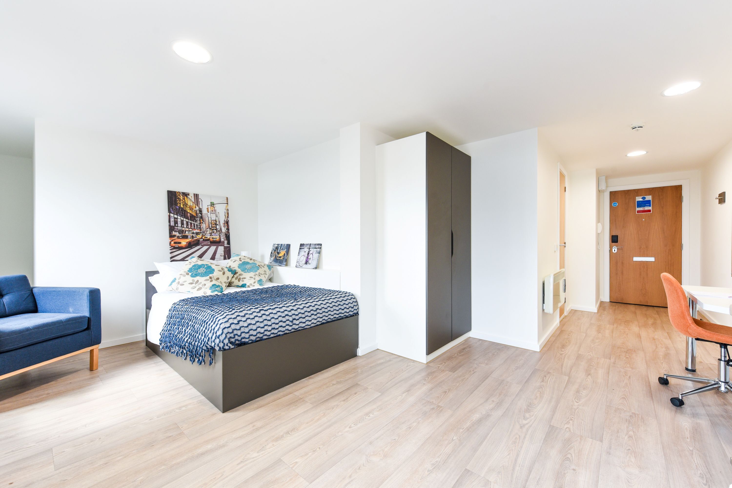 Communal kitchen and living space with TV. Up to 6 en-suite rooms per flat. Canal facing room with Balcony Approximately 13.5 - 14m² Small double bed Underbed storage, desk, chair and wardrobe provided in room