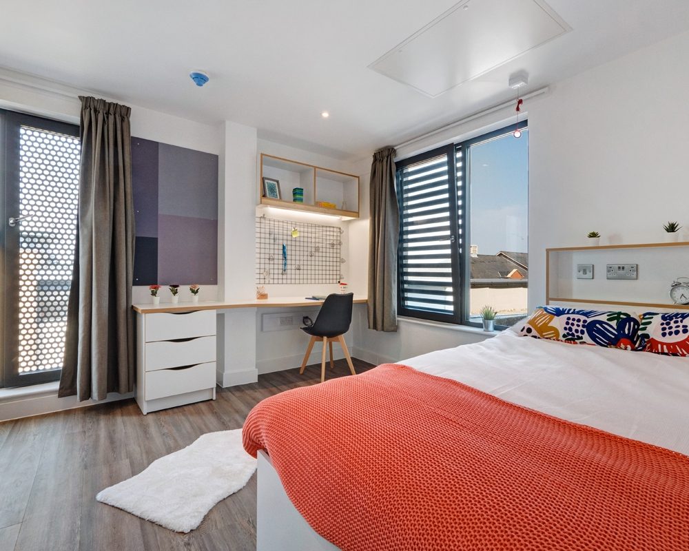 Room size- From 16.6m² 3/4 double bed Electric heater Wardrobe Bedside shelf Drawers, underbed storage & coat hooks Large desk and chair Bookshelves & noticeboard