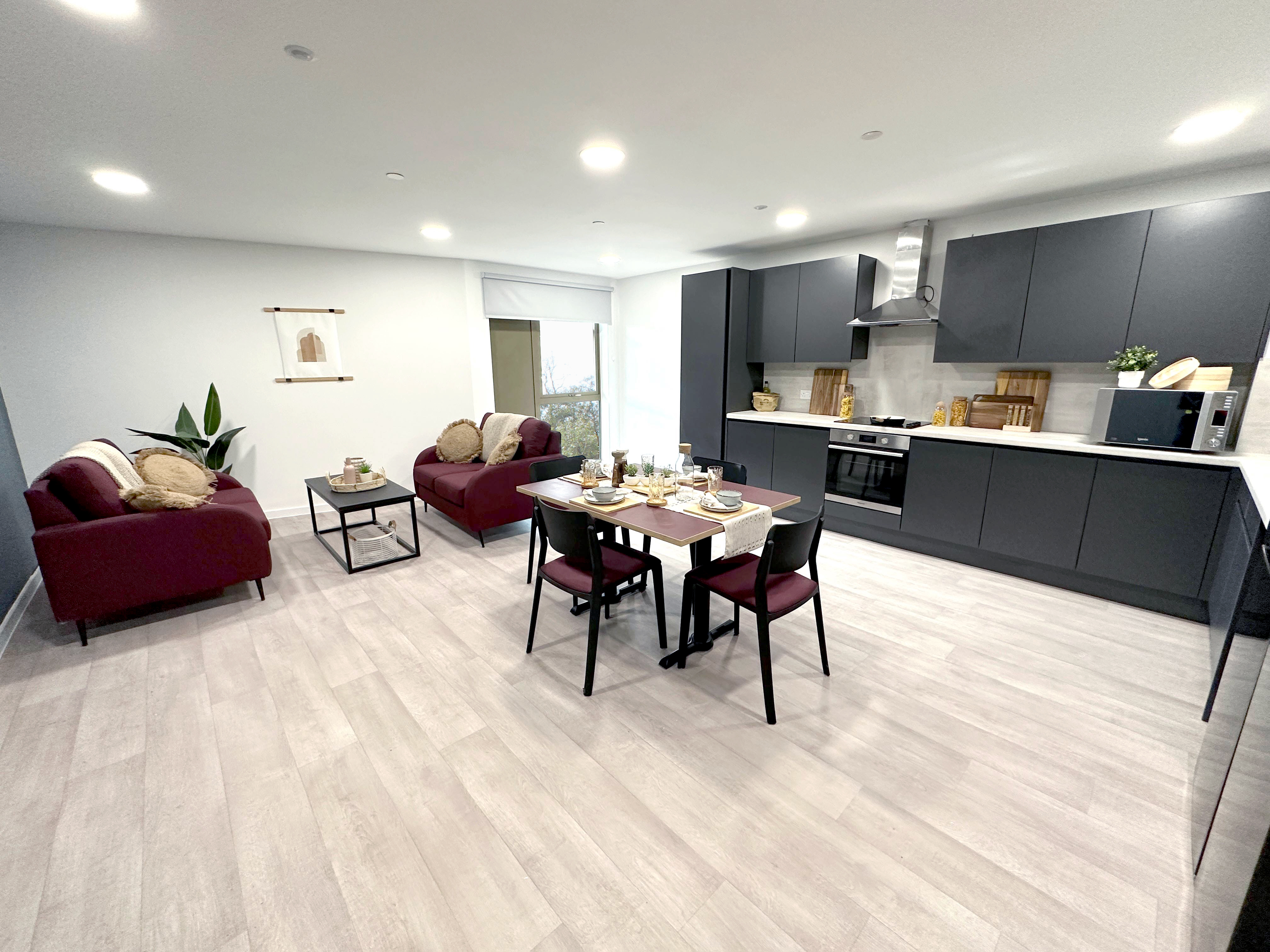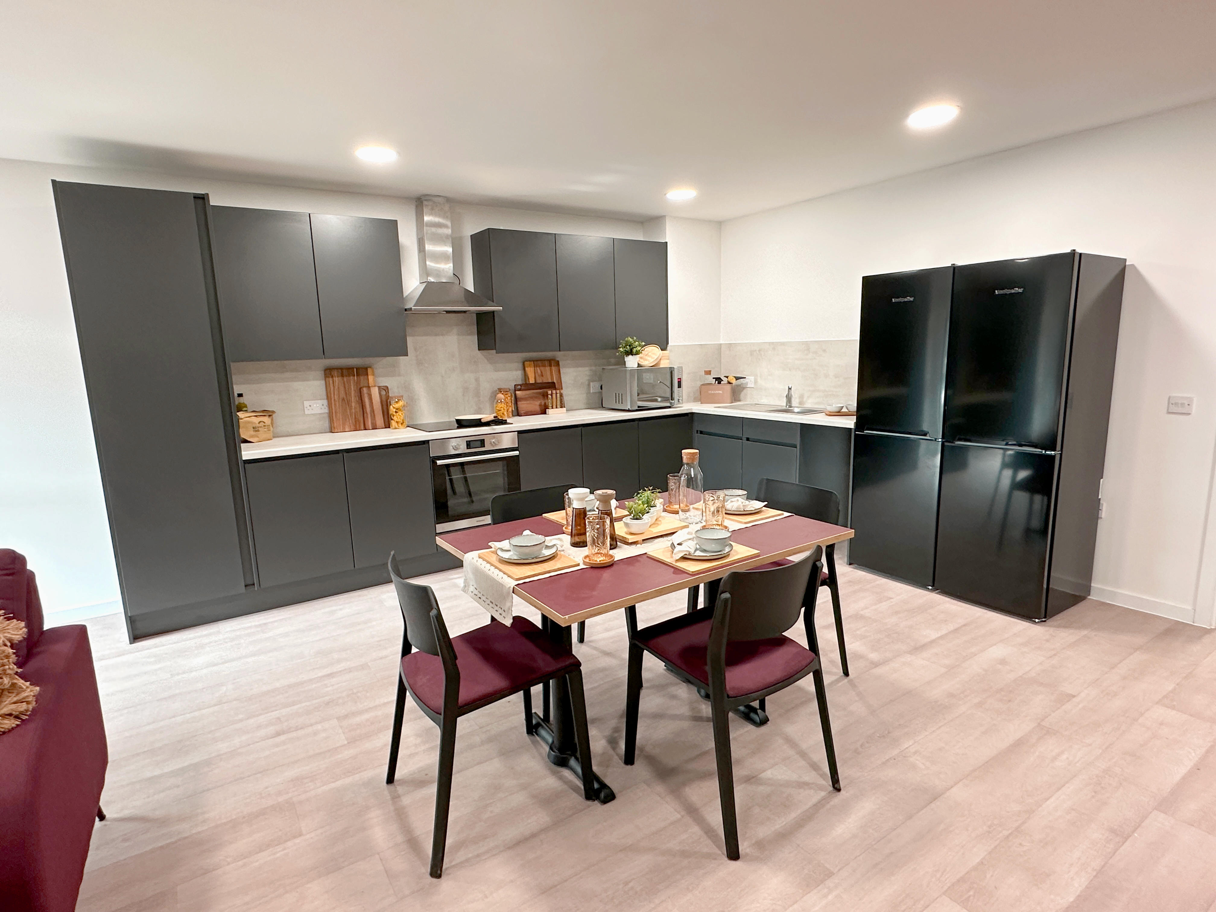 5-6-8 Bed, Room size: 15.0 - 15.7m2 --- Whats in the room? --- Bed - Chair & desk - Wardrobe - Private en-suite --- Whats in the shared kitchen? --- Classic Plus En-suite rooms are in shared flats of 8 - Shared kitchen with hob oven, fridge/freezer - Plenty of storage space - Dining table and seating - Lounge area with coffee table and TV
