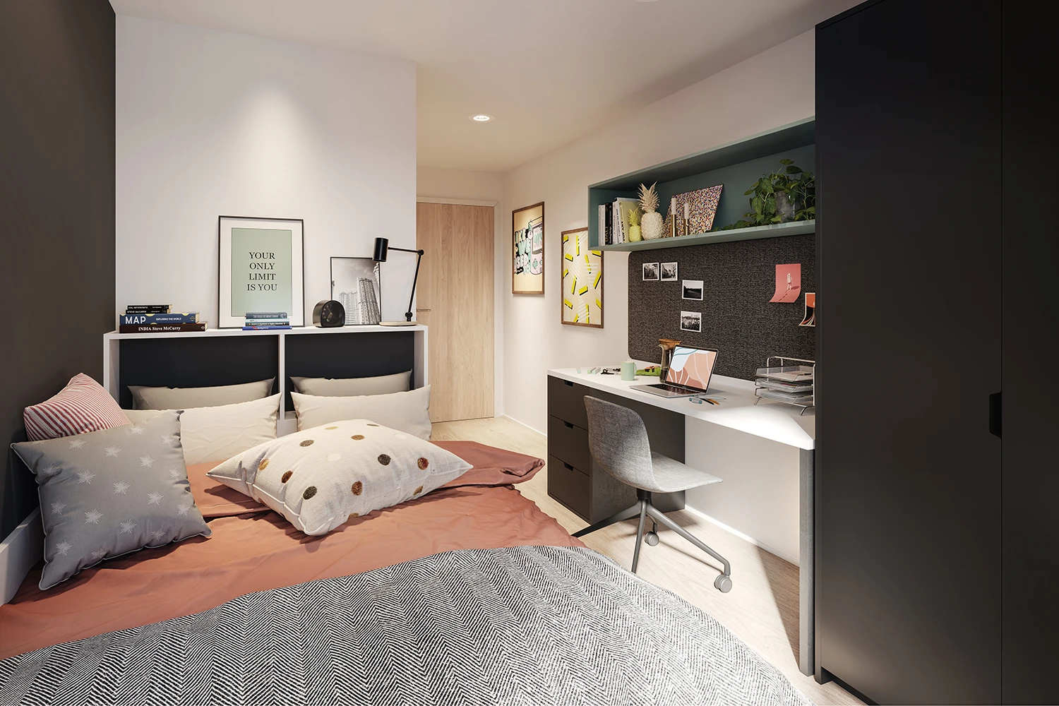 Room size: 15.0 - 15.7m² 3/4 Bed with underbed storage Chair & desk area Wardrobe and drawers Private en-suite bathroom Shared kitchen with hob oven, fridge/freezer Plenty of storage space Dining table and seating Lounge area with coffee table and TV