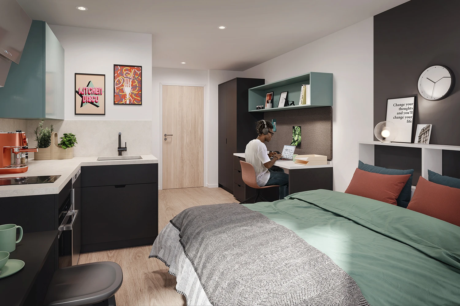 Room size: 25.4m2 --- Whats in the room? --- Bed - Chair & desk - Wardrobe - Private en-suite - Private kitchen with hob, oven fridge/freezer