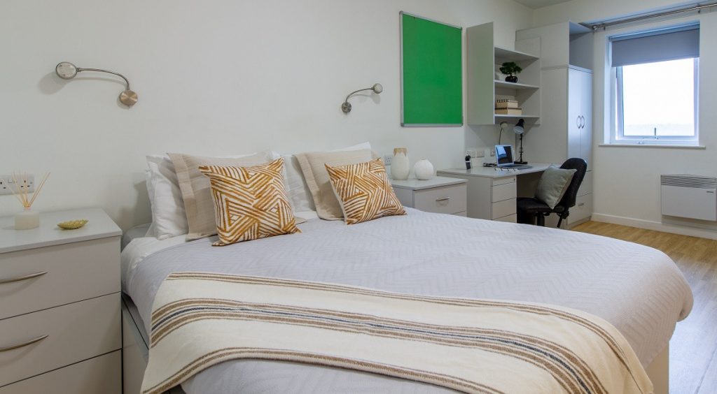 A larger en-suite bedroom with a ¾ bed which features under bed storage, study area and wardrobe. The shared area includes a kitchen with communal seating and up to 100Mbps WIFI throughout. Room layout and size may vary. Please book a viewing which can be done via video call to view our show flat of a Bronze Ensuite.