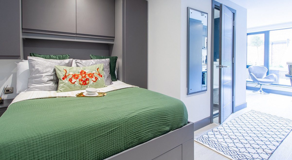 Very large self-contained studio comes a fully fitted kitchenette, stylish en-suite bathroom, and ample storage. Each studio boasts a three quarter bed, large study desk and chair, and a modern kitchenette.