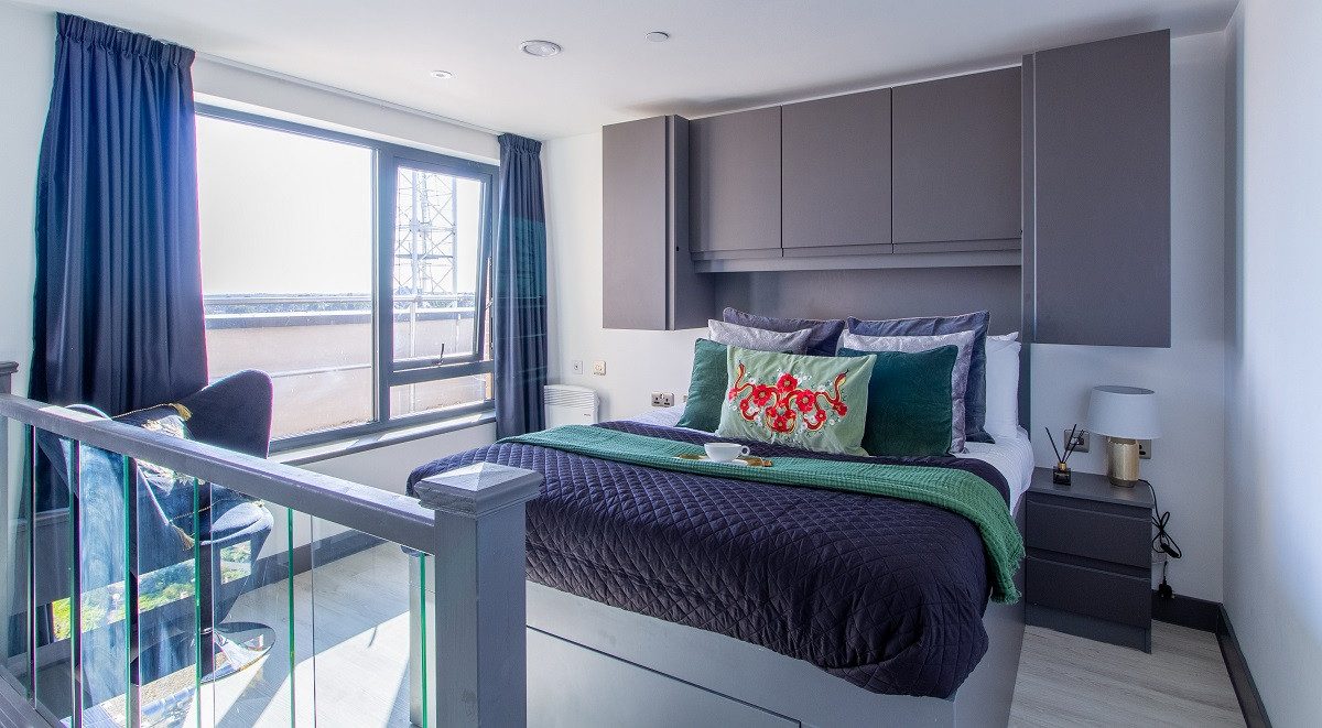 The Premium Mezzanine studio is split over two floors and comes complete a fully fitted kitchenette, stylish en-suite bathroom, a luxurious balcony, ample storage and panoramic views from the 9th floor. Each studio boasts a three quarter bed, large study desk and chair, a modern kitchenette and large windows to enjoy the view.