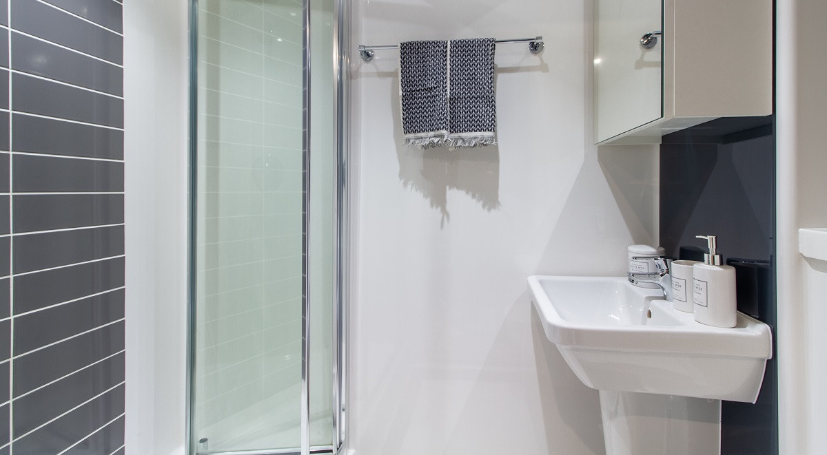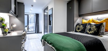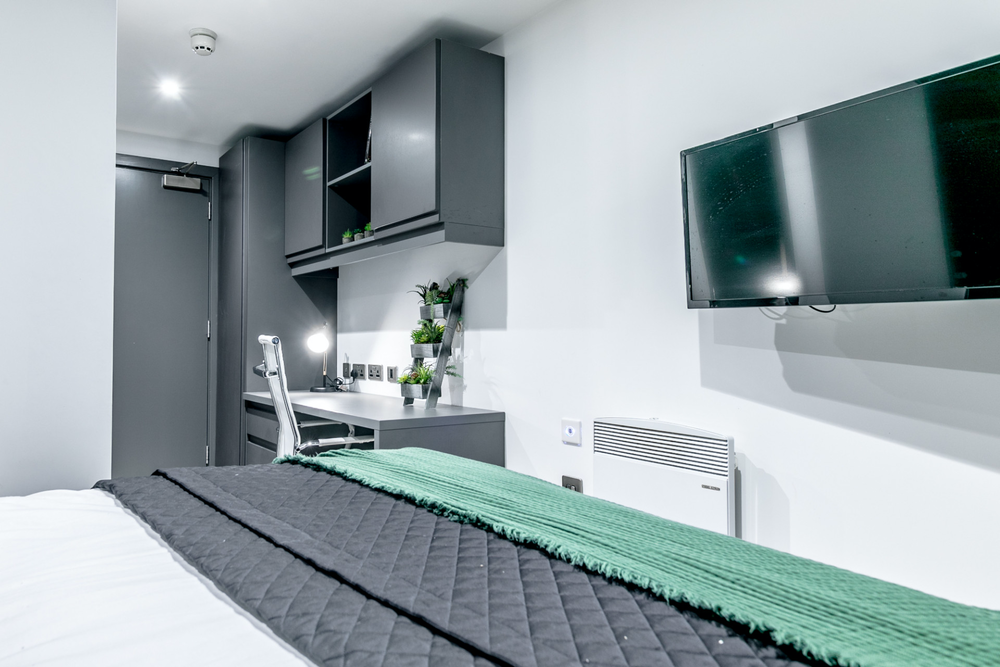 A modern private studio with a three quarter sized bed, stylish en-suite, and a large study desk and chair. This room is a large 20-22m2 with plenty of storage space throughout. You will also have residents only access to the private cinema room, gaming lounge, private hire dining room, fully equipped fitness suite, panoramic landscaped roof terrace as well as contemporary lounges.