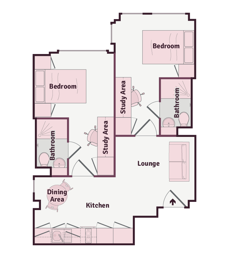 This spacious 2 bed apartment comes complete with a three quarter sized bed, generous storage and a luxurious balcony. This room also boasts a fully fitted modern kitchenette, large study area, and a stylish en-suite bathroom per room.