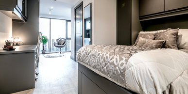 The Premium Mezzanine studio is split over two floors and comes complete a fully fitted kitchenette, stylish en-suite bathroom, a luxurious balcony, ample storage and panoramic views from the 9th floor. Each studio boasts a three quarter bed, large study desk and chair, a modern kitchenette and large windows to enjoy the view. You will also have residents only access to the private cinema room, gaming lounge, private hire dining room, fully equipped fitness suite, panoramic landscaped roof terrace as well as contemporary lounges.