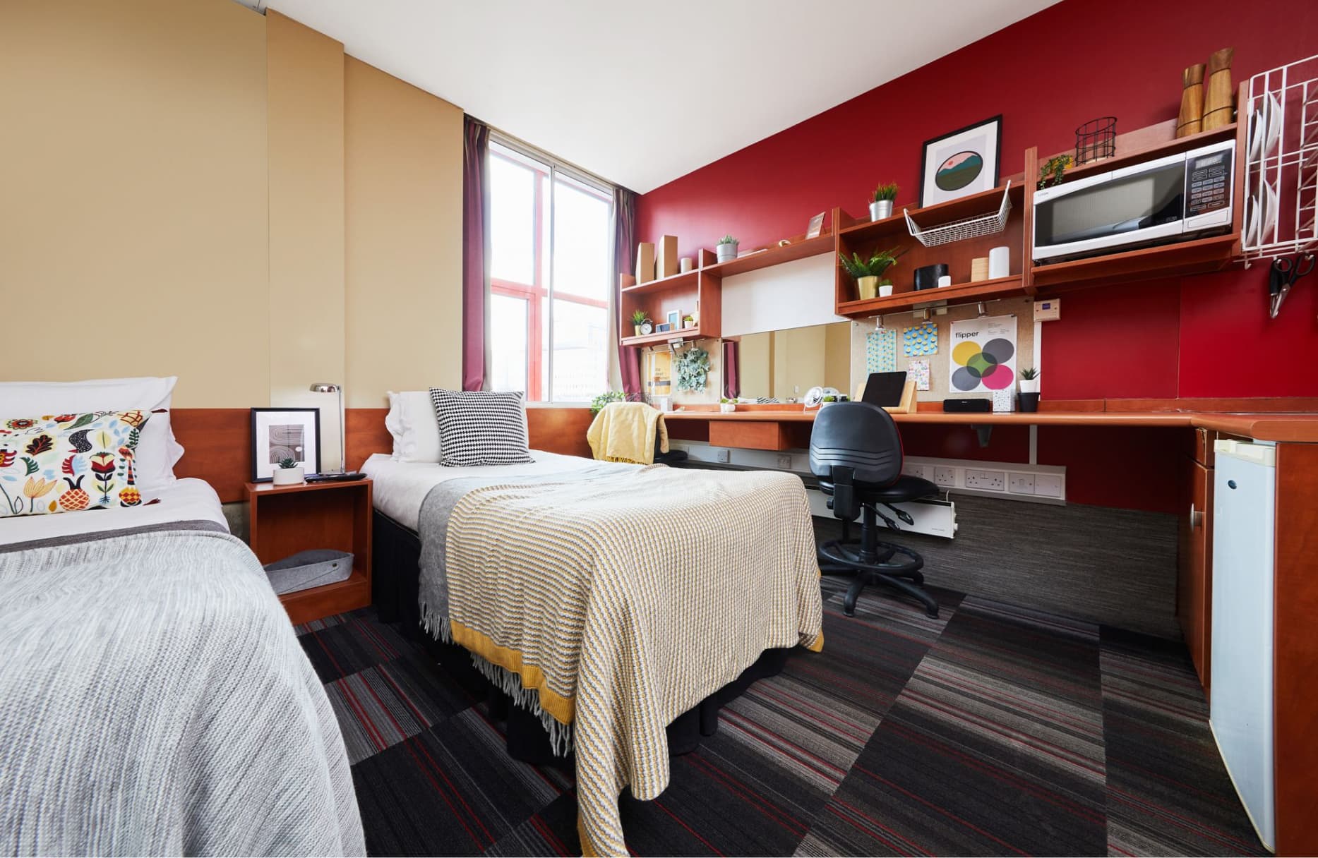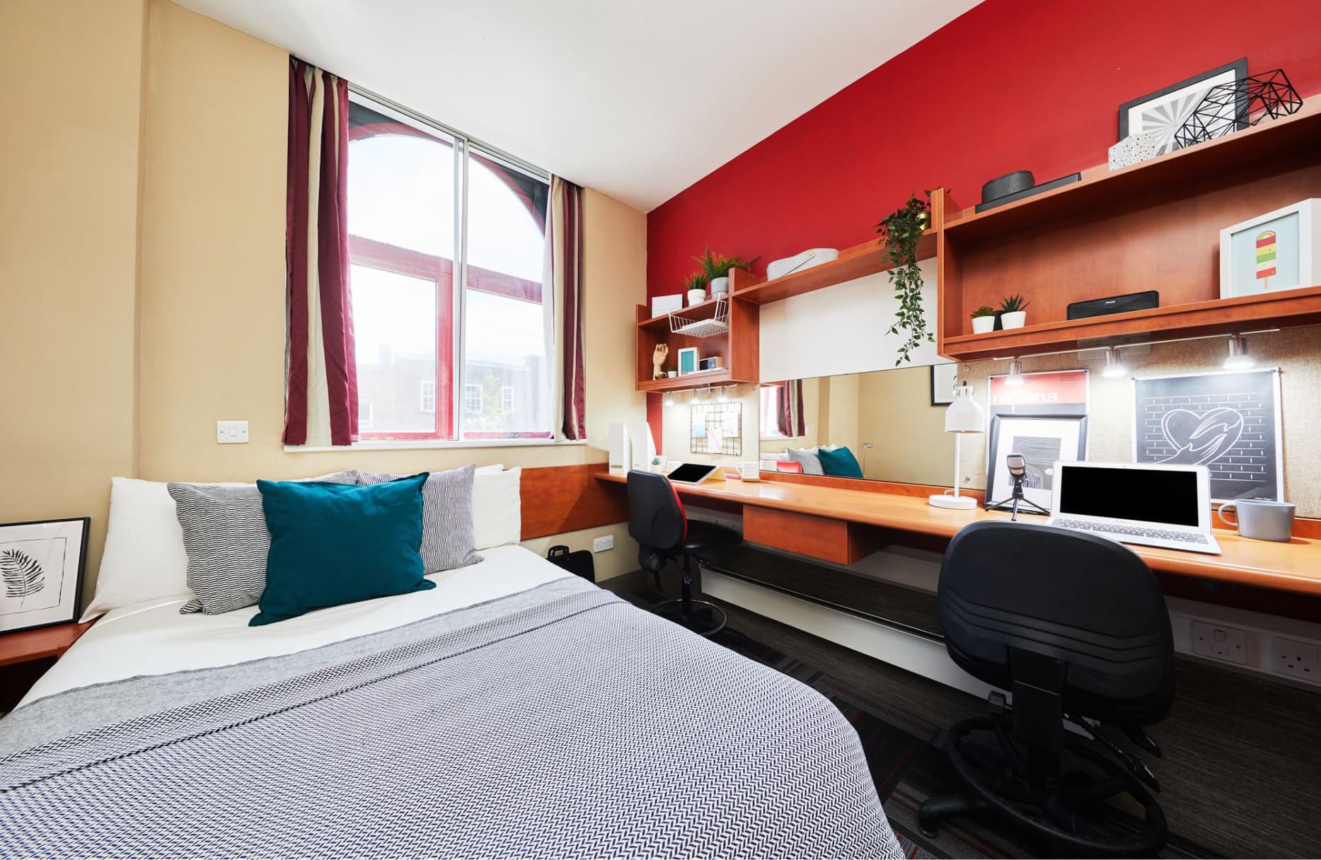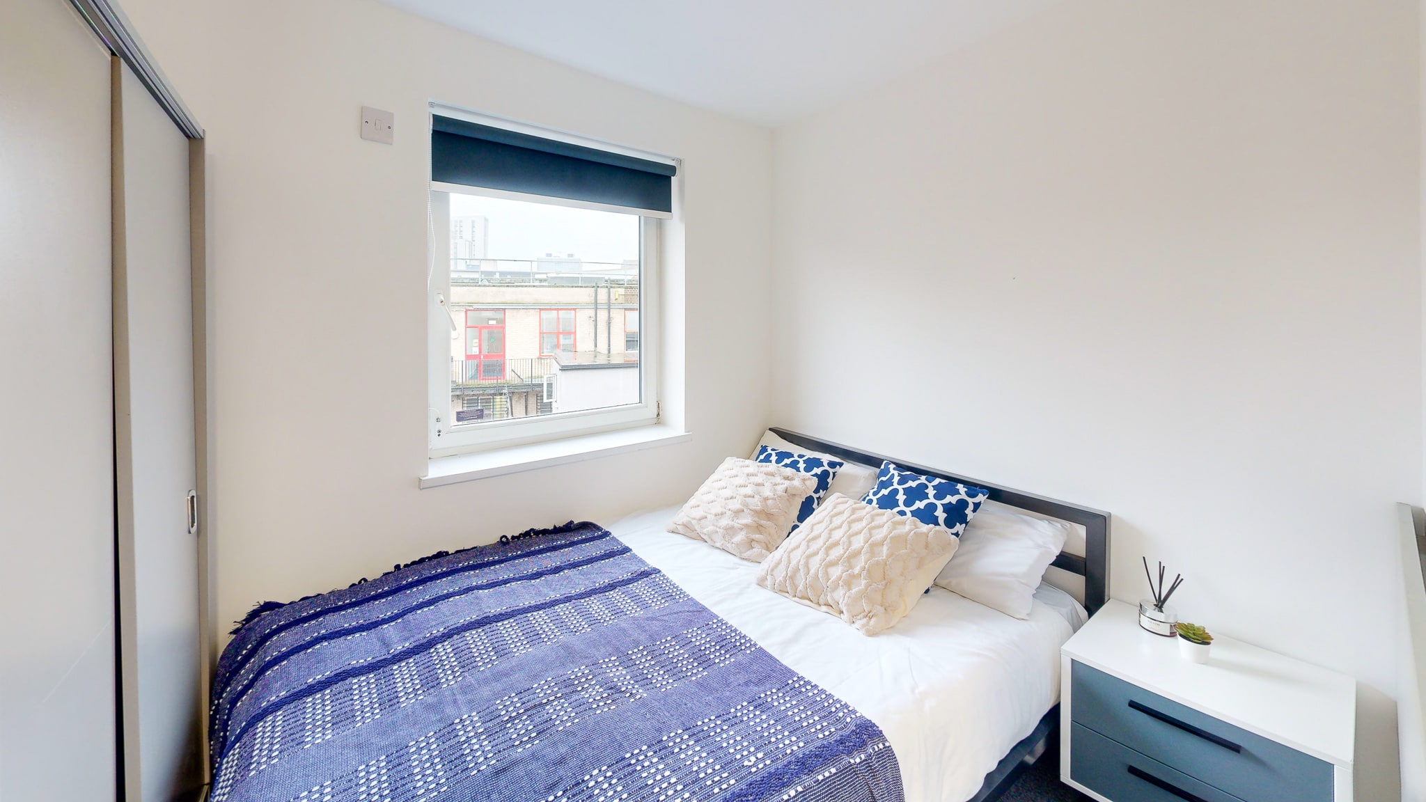 Slightly bigger studio apartment with double bed Double Bed En-suite shower room, fully equipped kitchenette Dining table Flat screen TV Study Desk and Chair Storage space Spacious wardrobe Superfast Wi-Fi. Dual Occupancy Available.