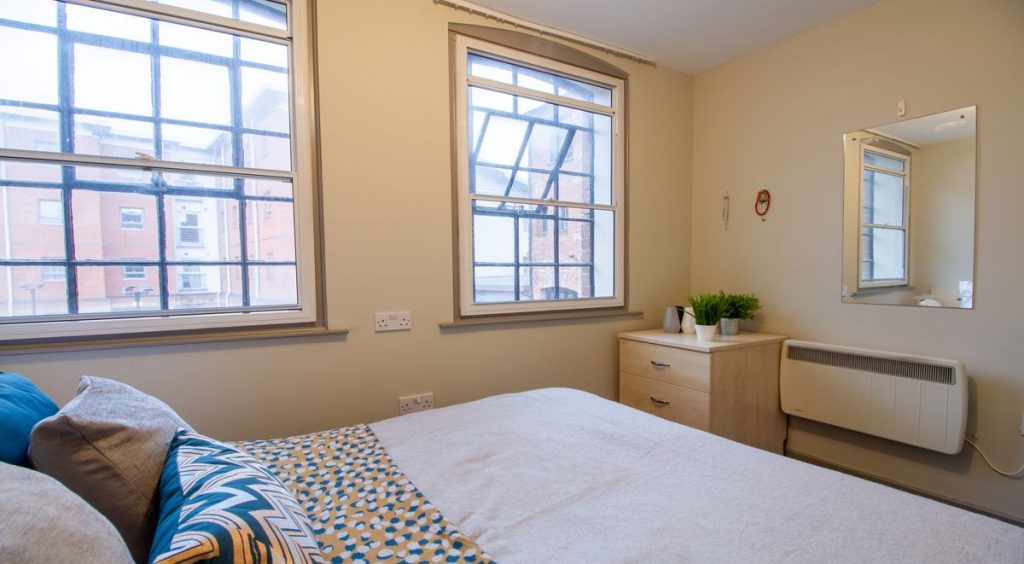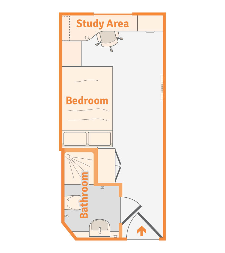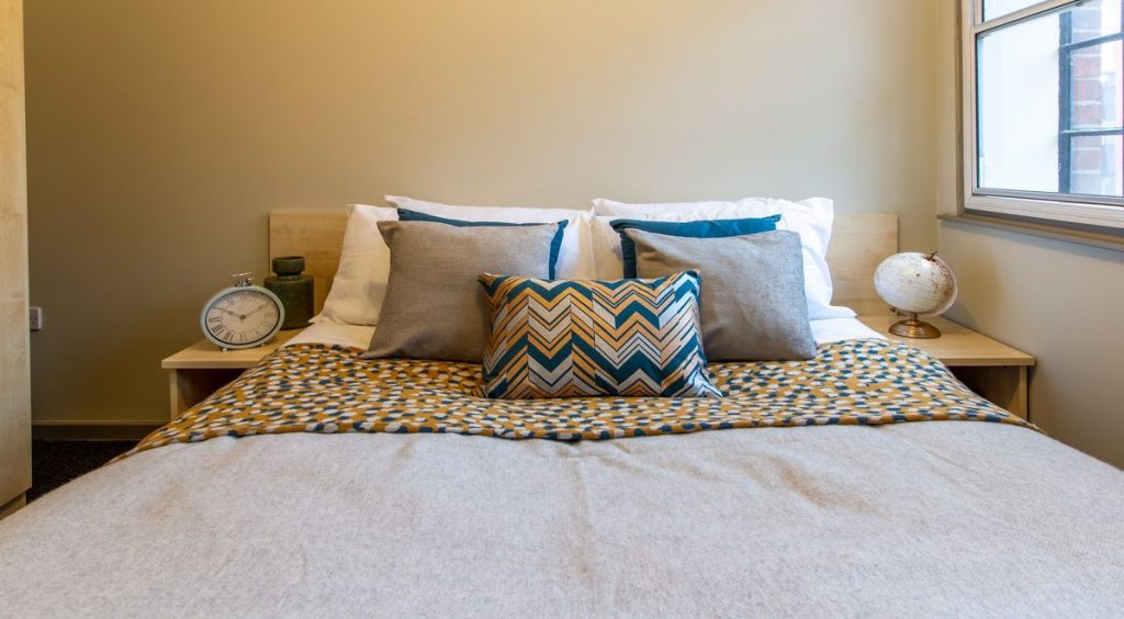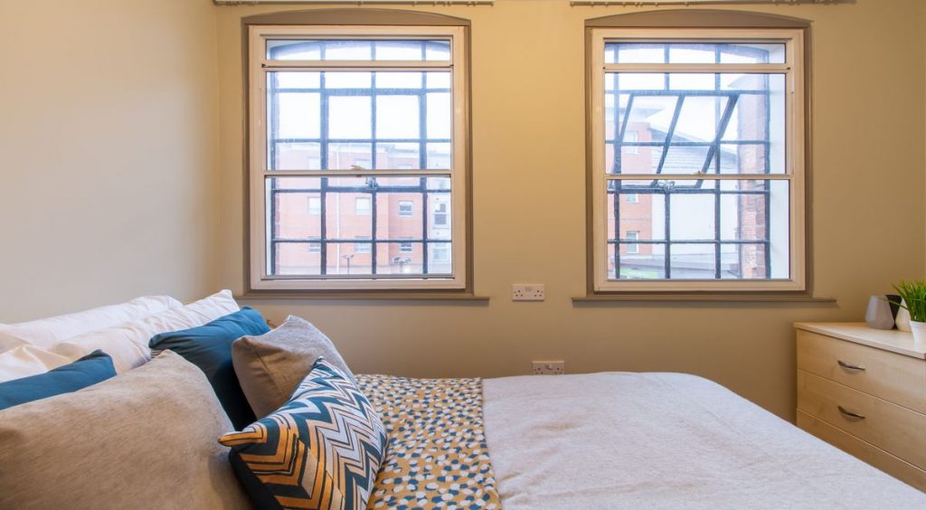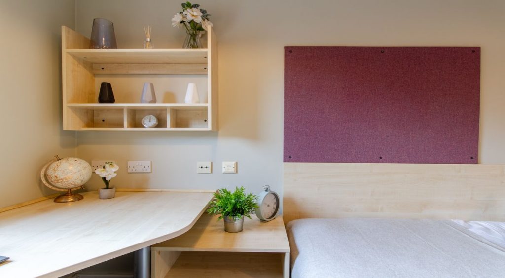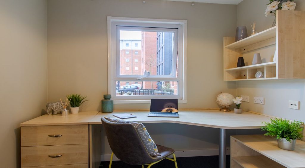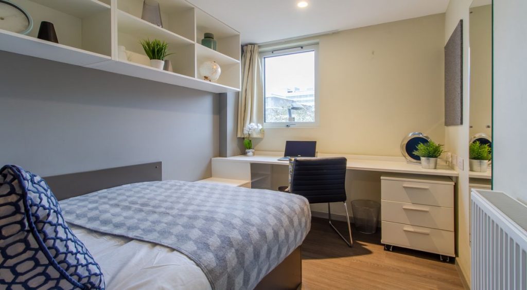 The residence has a diverse collection of room types equipped to meet all your needs. Calcott Ten student accommodation offers comfortable en-suite rooms, large studios, and luxurious apartments. An en-suite room is the best choice if you are looking for private rooms on a budget. These rooms include a cosy ¾ double bed, storage and a wardrobe with access to an attached bathroom. The en-suite rooms are housed in flats, so you can enjoy shared spaces like the living room and kitchen. This means that you can reduce your monthly costs by sharing groceries and living expenses with your roommates. The Calcott Ten Bronze Ensuite room is a popular choice among the student community.