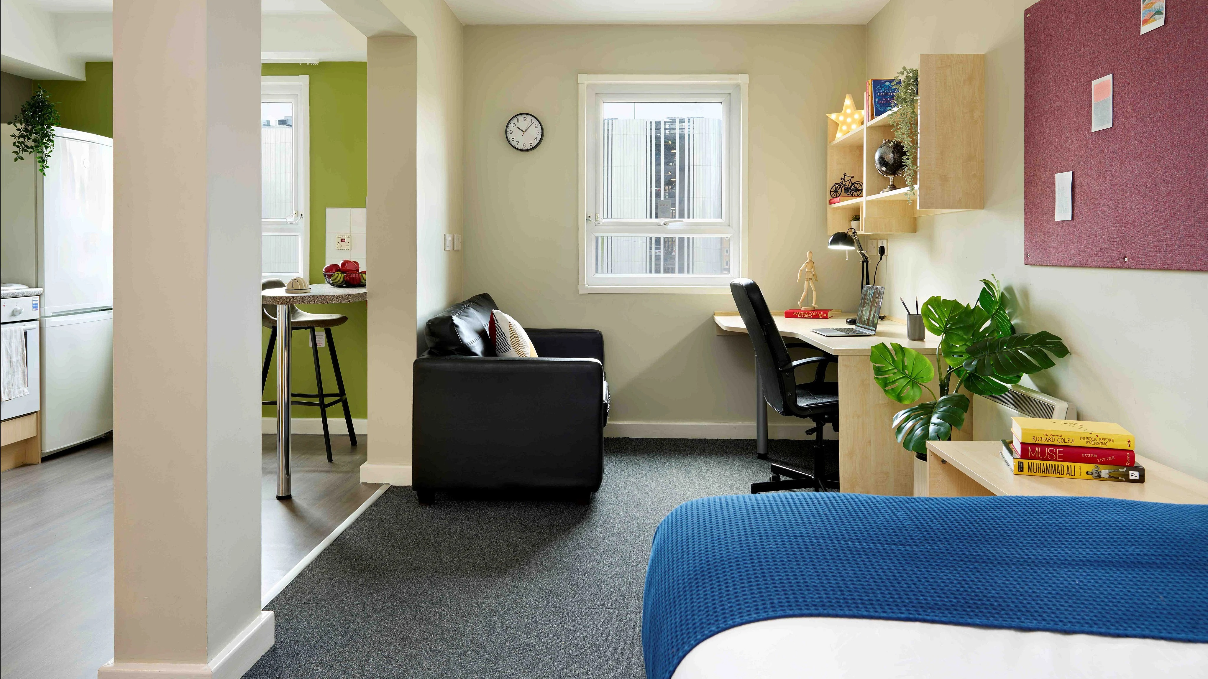 This Classic Studio comes with a double bed, study area, ensuite bathroom and fully fitted kitchenette. You will also have access to the communal areas, outdoor social space and study spaces.