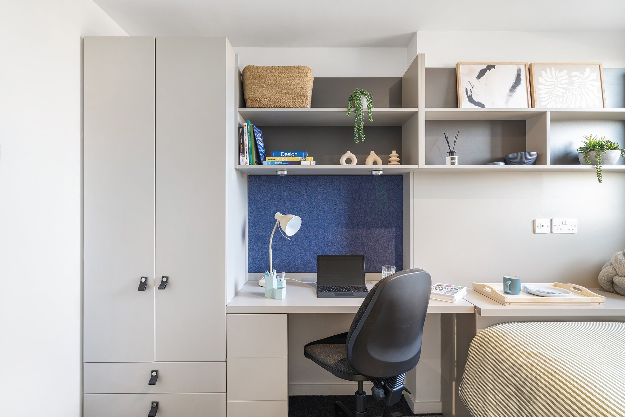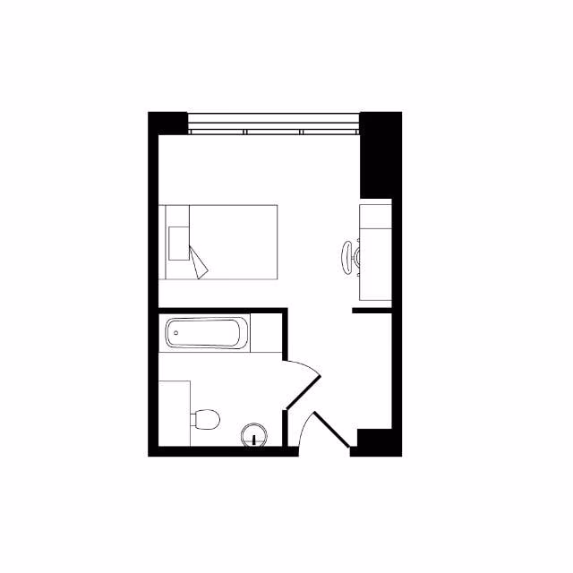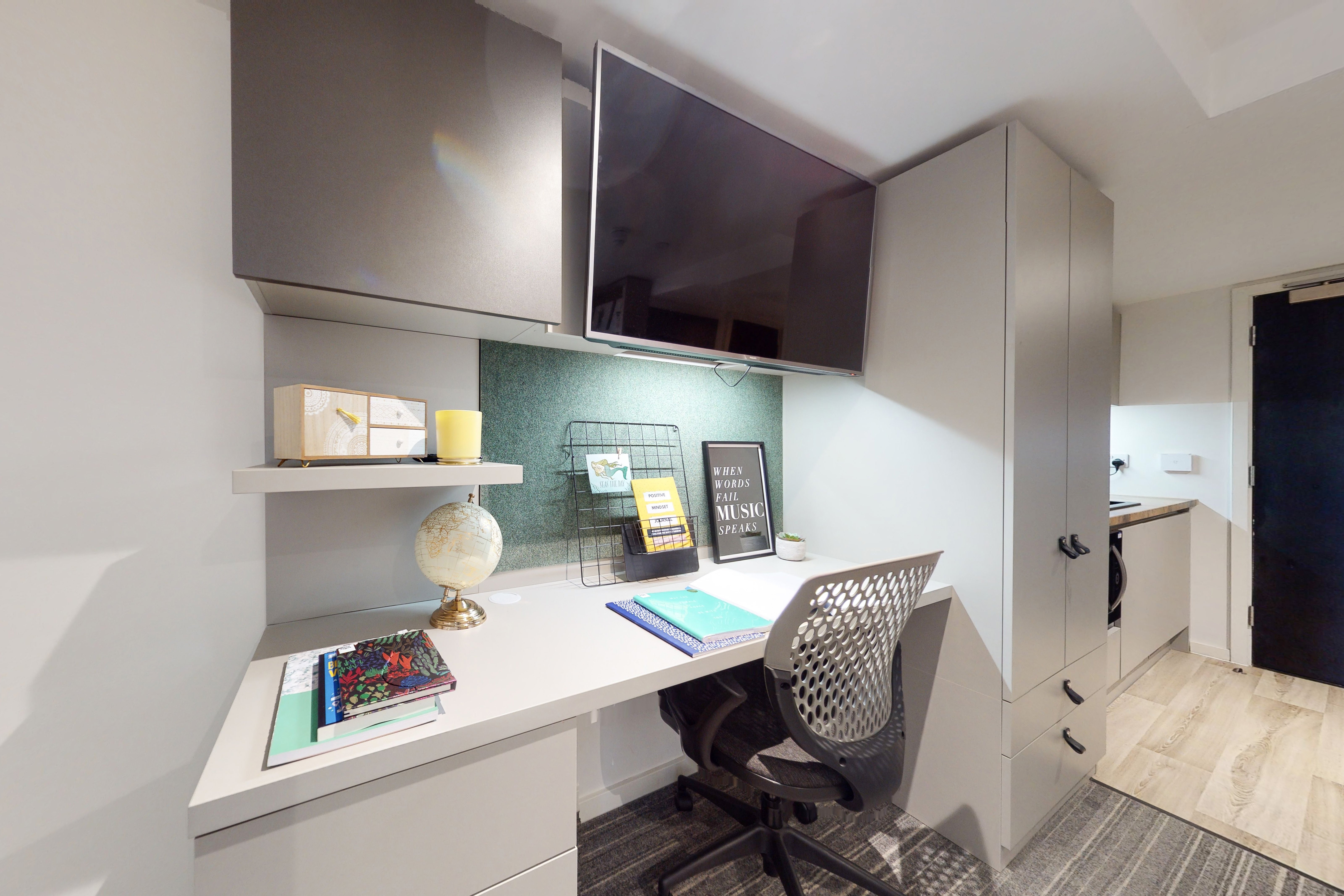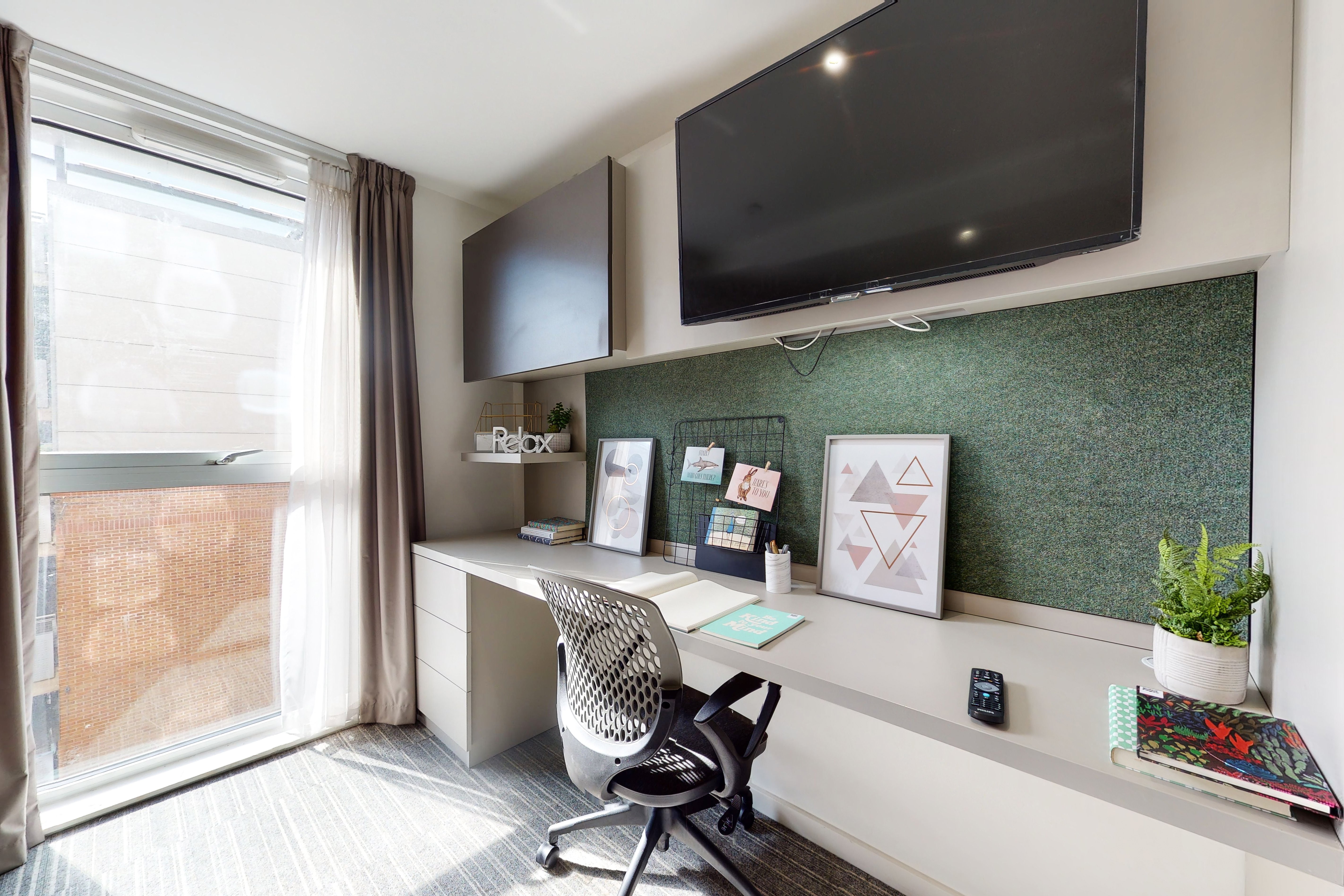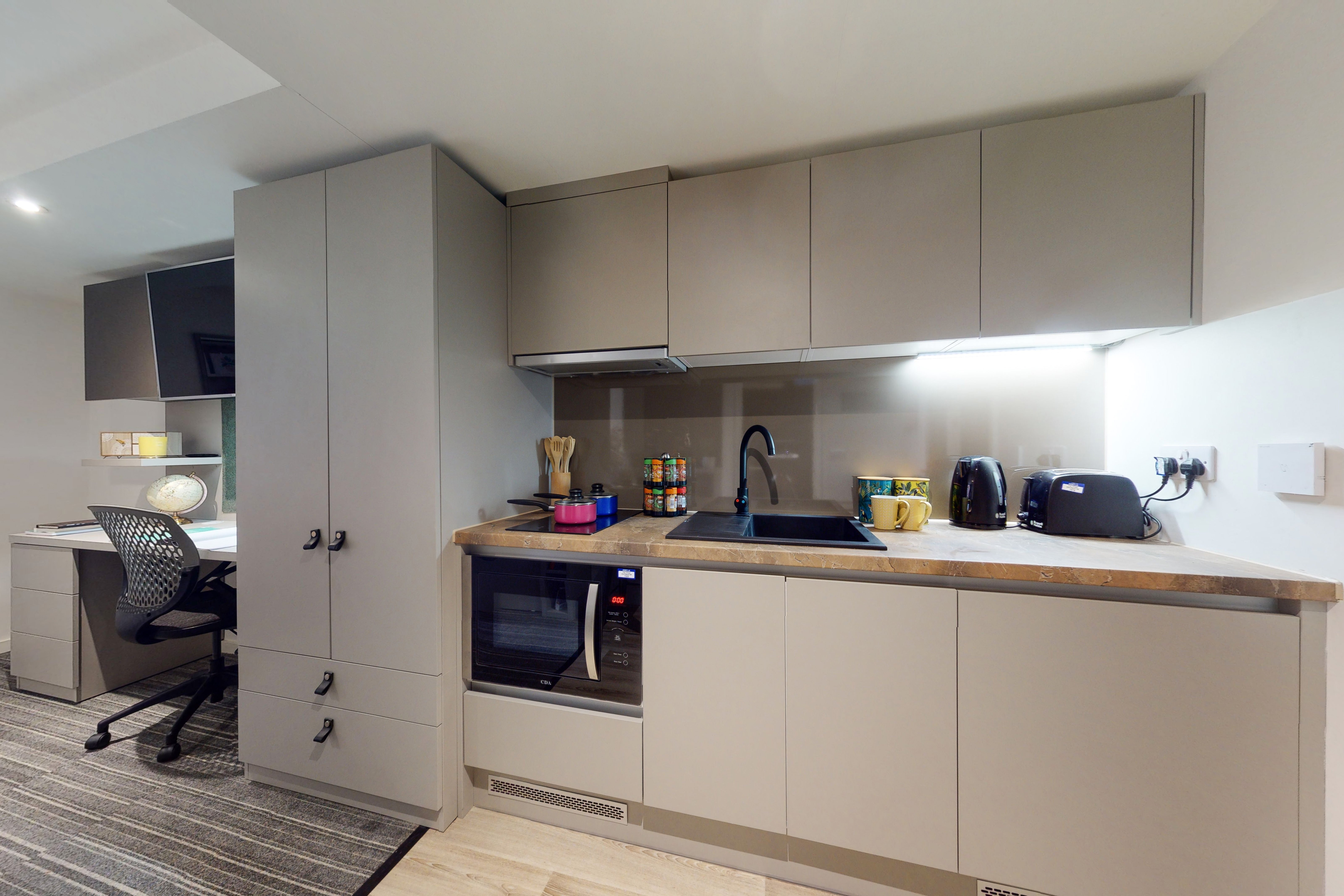 Study desk & chair, wardrobe & additional storage space, private kitchen with cooking facilities, fridge/freezer & sink, private bathroom with shower, toilet & basin.