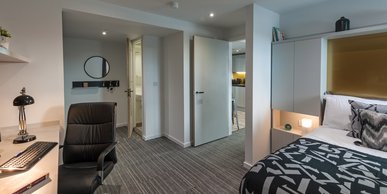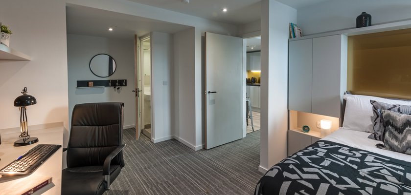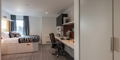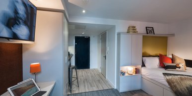 This is spacious student living at it’s best. Situated on floors 4 - 7 with average of 24.8m2, the studio comes equipped with stylish fitted furniture, a modern kitchen, large comfy bed and Smart TV. The en-suite has a bath. A fridge/freezer, microwave, kettle and toaster are supplied, as well as an iron, ironing board and vacuum cleaner are also available. Just add your choice of bedding, towels and kitchen utensils.