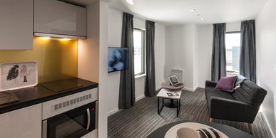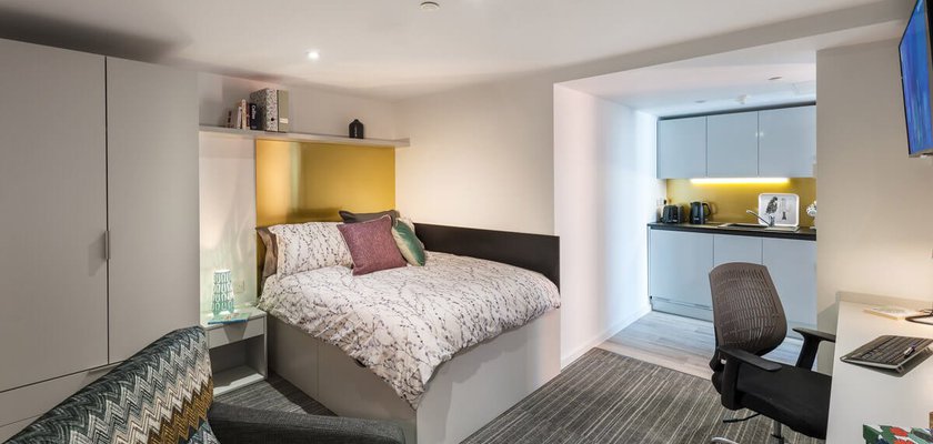 This is spacious student living at it’s best. Situated on floors 17 - 19 with average of 20.56m2, the studio comes equipped with stylish fitted furniture, a modern kitchen, large comfy bed and Smart TV. A fridge/freezer, microwave, kettle and toaster are supplied, as well as an iron, ironing board and vacuum cleaner are also available. Just add your choice of bedding, towels and kitchen utensils.