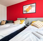 Larger private studio apartment with double bed, situated in Block A Double Bed En-suite shower room Fully equipped kitchenette Dining table Flat screen TV Comfortable recliner chair Study Desk and Chair Storage space with bigger wardrobe space Superfast Wi-Fi