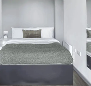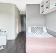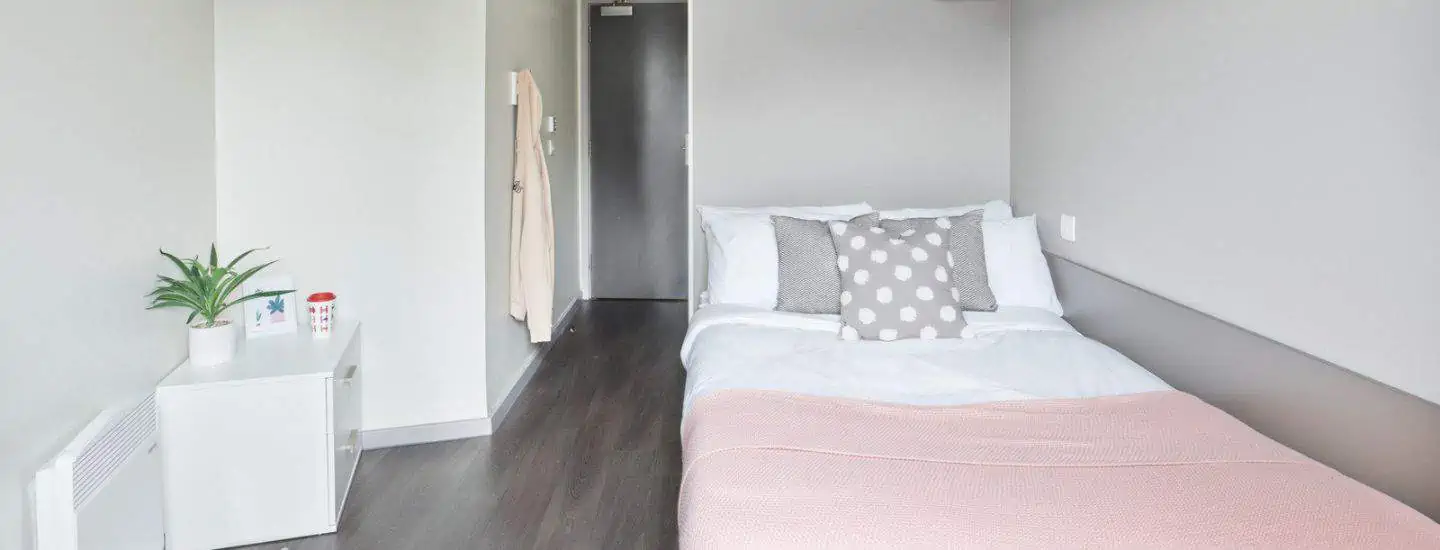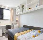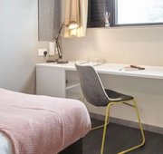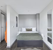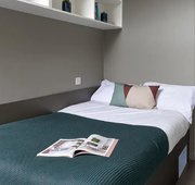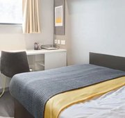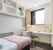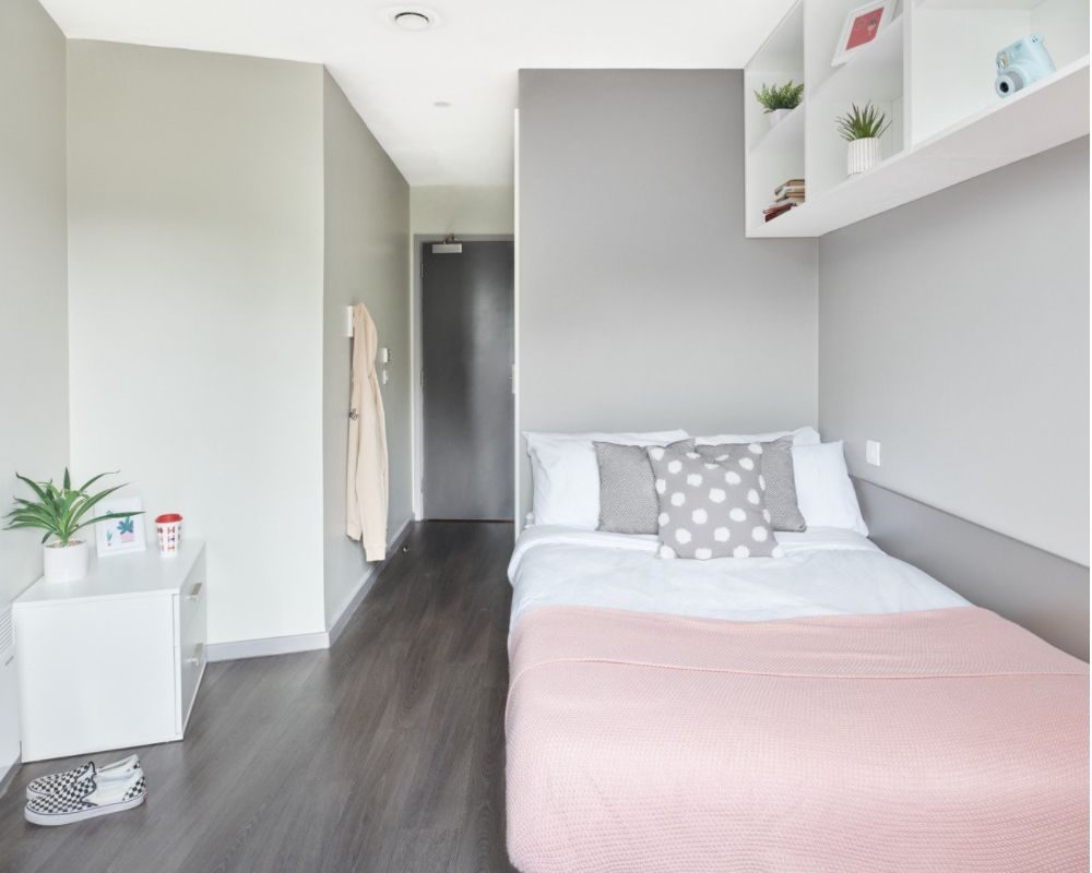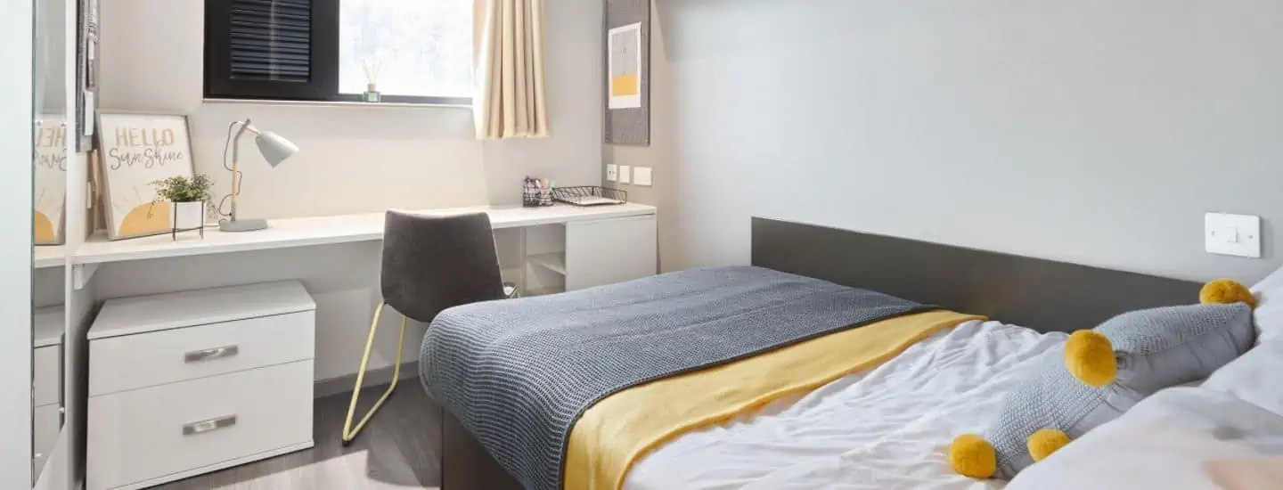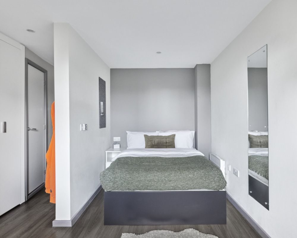 Room size-From 11m², Flat size-5-9 bedrooms, Bed-¾ double bed, Storage-Wardrobe, drawers, coat hooks & underbed storage, Studying- Large desk and chair, bookshelves & noticeboard, Heating- Electric heater