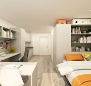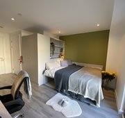 Located between the 10th and 18th floors, our Luxe Studios offer a premium living experience with stunning elevated views. With a size of up to 17m², these studios feature a well-designed layout, including a small double bed, monitor, extra storage space, and a kitchenette equipped with an induction hob, fridge-freezer, and combination oven, perfect for independent living. The room also includes French windows that allow plenty of natural light to fill the space, creating a bright and welcoming atmosphere. Ideal for those who seek privacy, comfort, and a peaceful environment on higher floors, these studios o er both style and convenience.