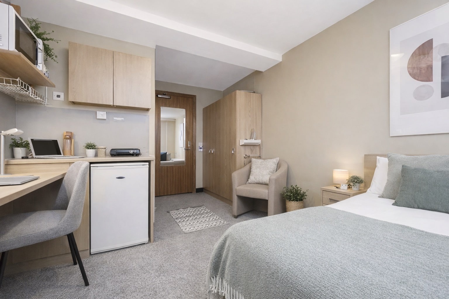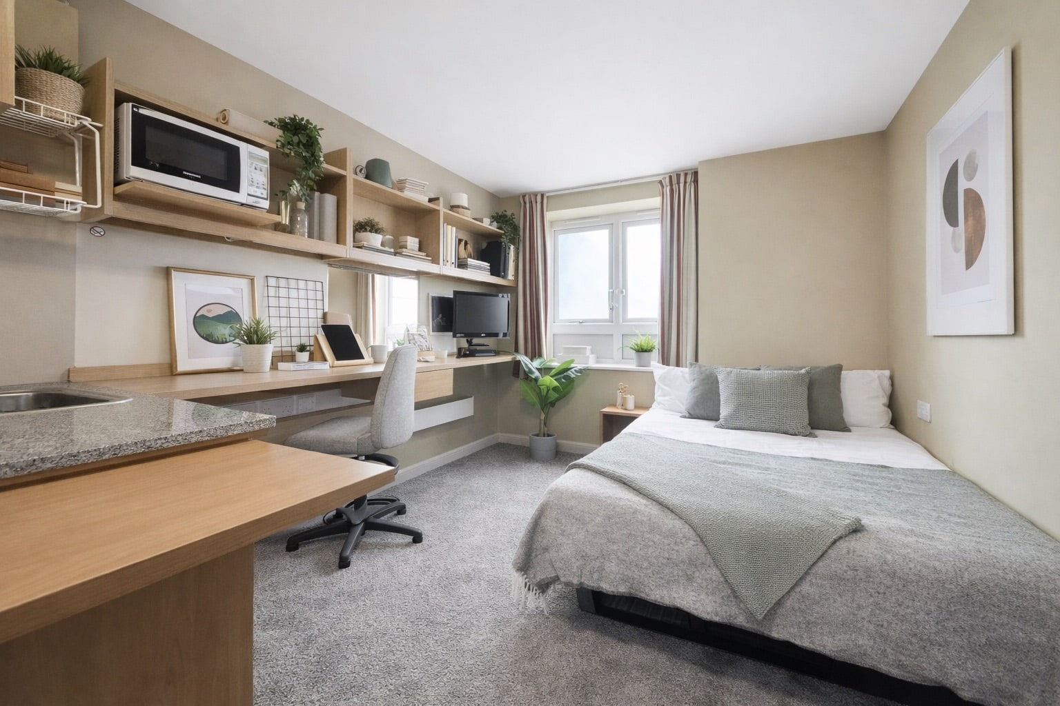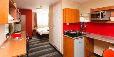 Slightly bigger studio apartment with double bed What's included Double Bed En-suite shower room Fully equipped kitchenette Flat screen TV Study Desk and Chair Storage space Superfast Wi-Fi