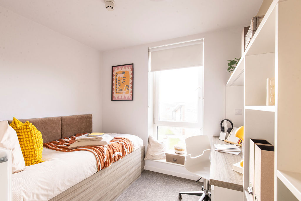Room sizes vary between approximately 9-12m2 - Your own private bedroom - Private en-suite with shower - Single bed - Wardrobe - Study desk, chair and storage - Noticeboard - Shared kitchen / lounge between 7 - Dining table and chairs - Lounge area with sofas and coffee table