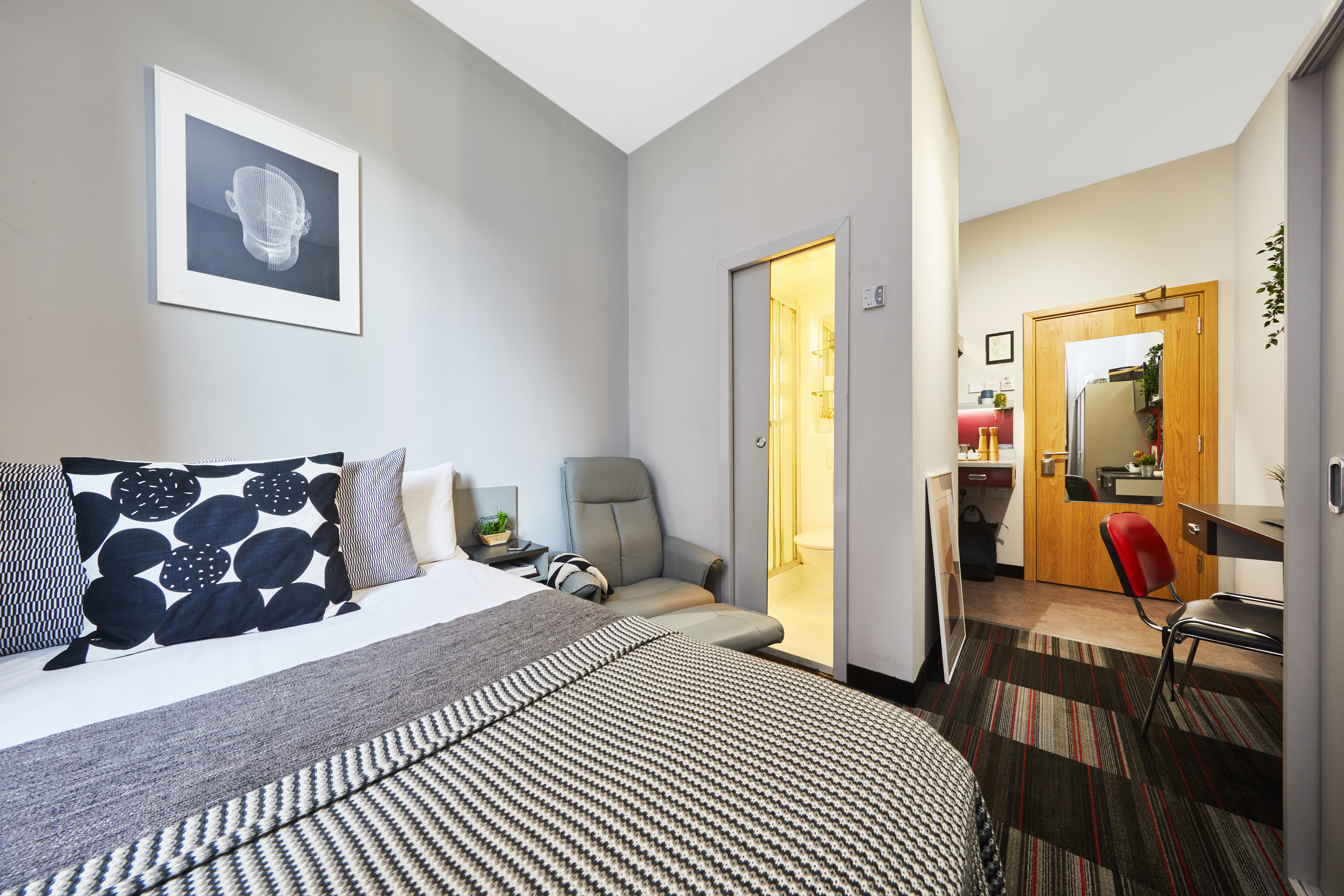 Location: 7th Floor, Double bed, Private ensuite shower room, Desk and study chair, Mirror, Double Wardrobe, Living area with comfy seating, Fully fitted kitchen
