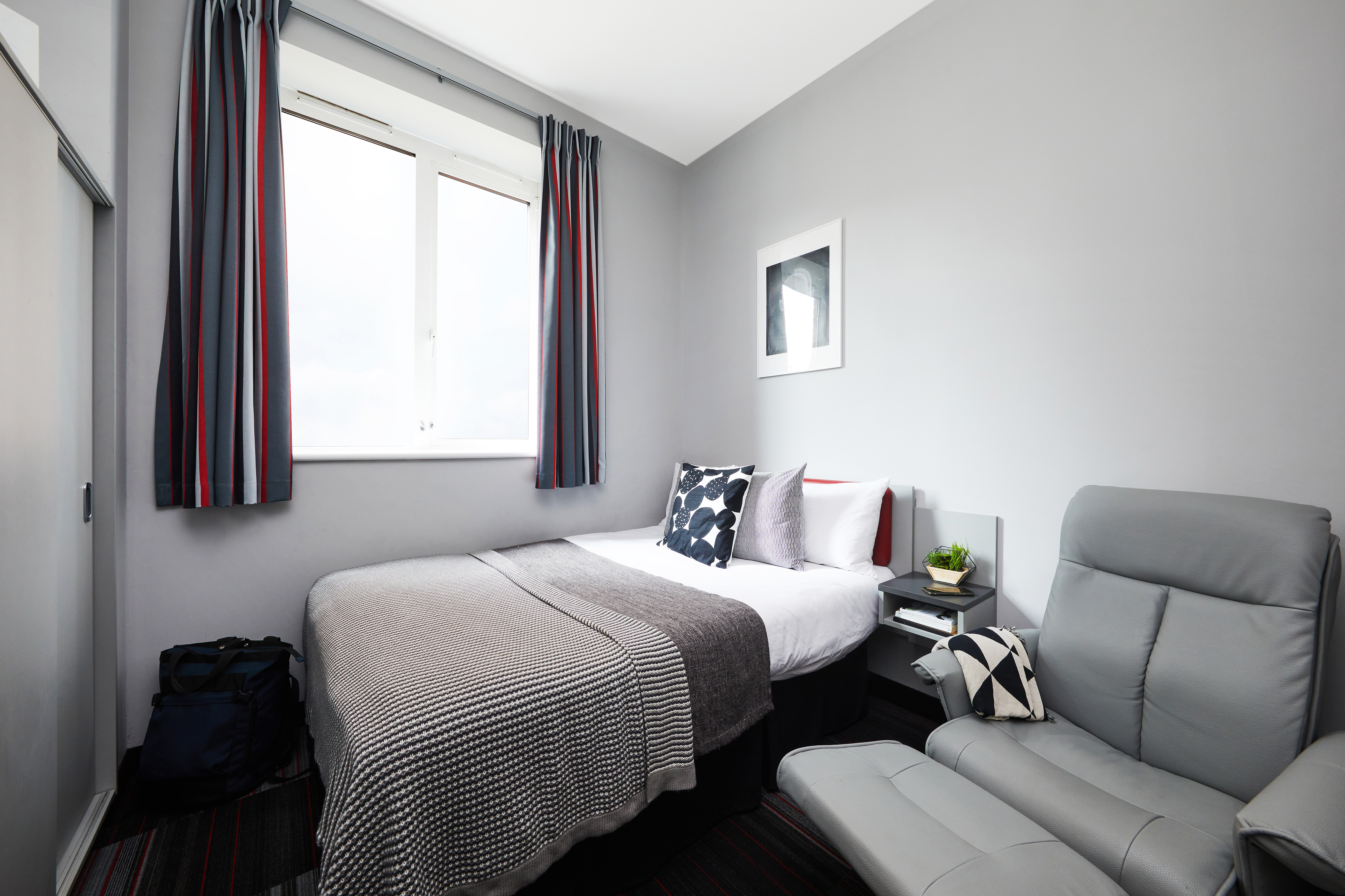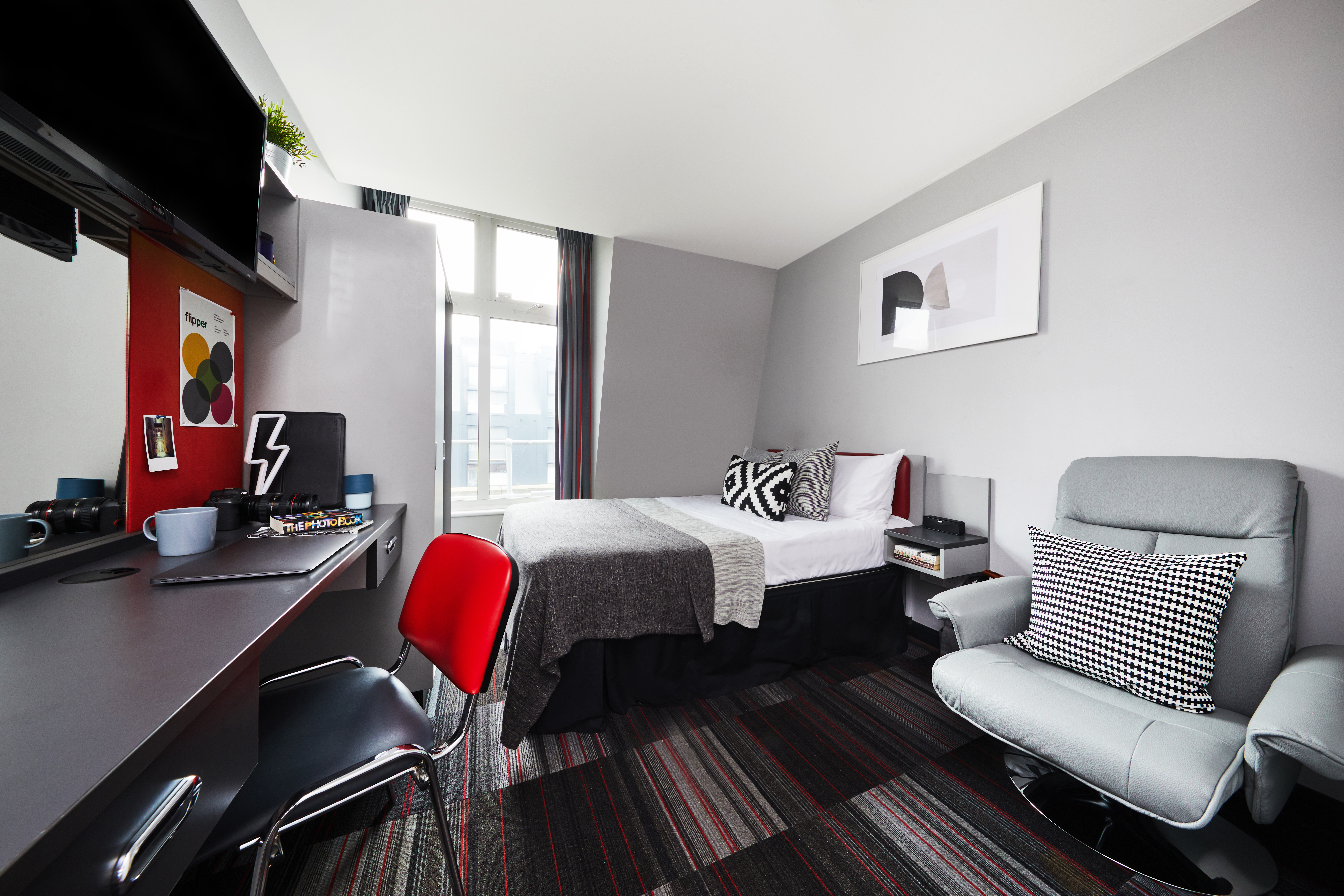 Location: Floor 5-7, Single bed, Private ensuite shower room, Desk and study chair, Lots of shelving and storage, Living area with comfy seating, Fully fitted kitchen, Microwave combi Oven