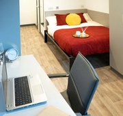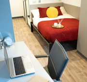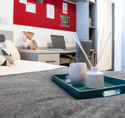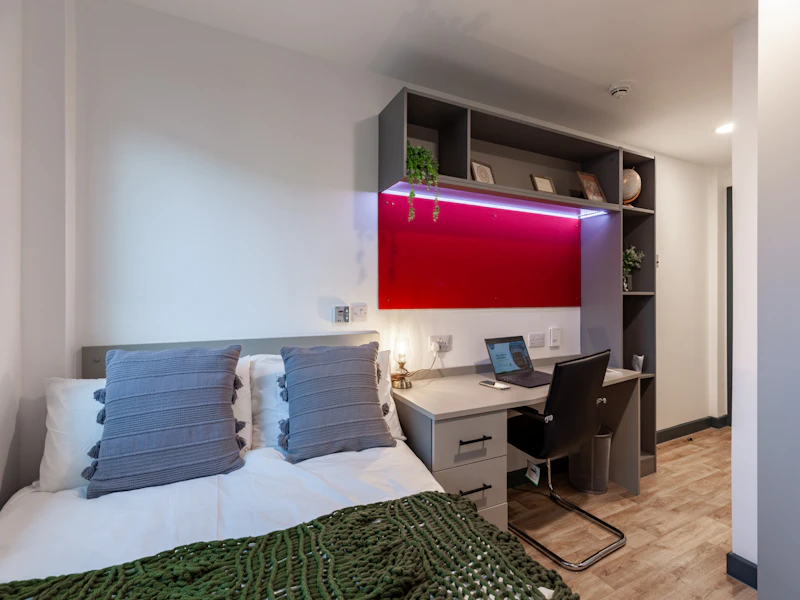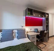 Ensuite facilities with large shower cubicle Small double beds Comfortable leather, armed chair Spacious wardrobe and plenty of storage space with cabinets and storage on the side and above the desk Pinboard Large desk space 200mb/s internet and up to 100mb/s Wi-Fi